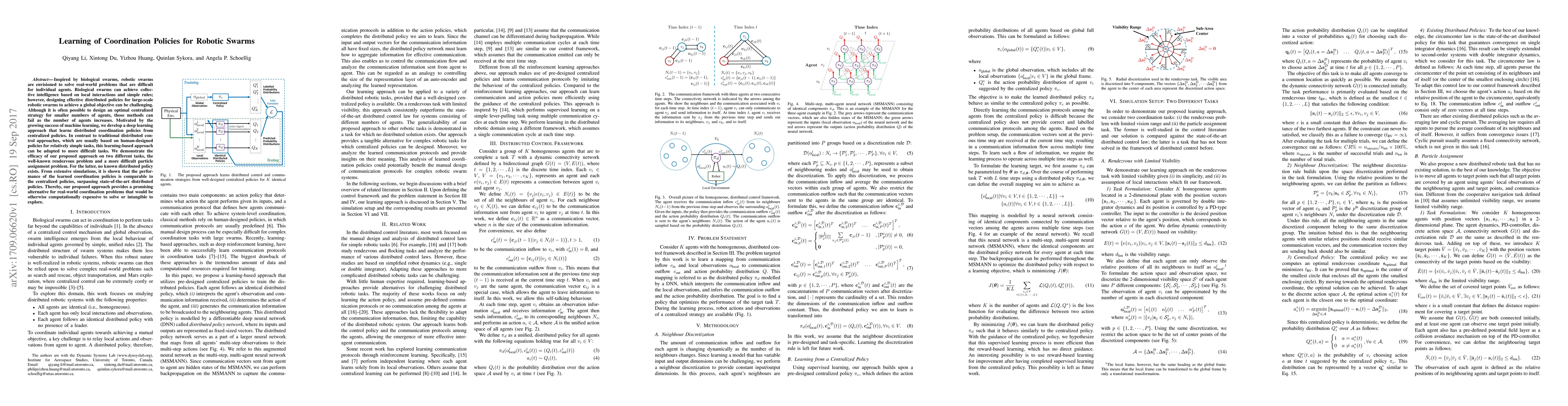 Inspired by biological swarms, robotic swarms are envisioned to solve real-world problems that are difficult for individual agents. Biological swarms can achieve collective intelligence based on local interactions and simple rules; however, designing effective distributed policies for large-scale robotic swarms to achieve a global objective can be challenging. Although it is often possible to design an optimal centralized strategy for smaller numbers of agents, those methods can fail as the number of agents increases. Motivated by the growing success of machine learning, we develop a deep learning approach that learns distributed coordination policies from centralized policies. In contrast to traditional distributed control approaches, which are usually based on human-designed policies for relatively simple tasks, this learning-based approach can be adapted to more difficult tasks. We demonstrate the efficacy of our proposed approach on two different tasks, the well-known rendezvous problem and a more difficult particle assignment problem. For the latter, no known distributed policy exists. From extensive simulations, it is shown that the performance of the learned coordination policies is comparable to the centralized policies, surpassing state-of-the-art distributed policies. Thereby, our proposed approach provides a promising alternative for real-world coordination problems that would be otherwise computationally expensive to solve or intangible to explore.