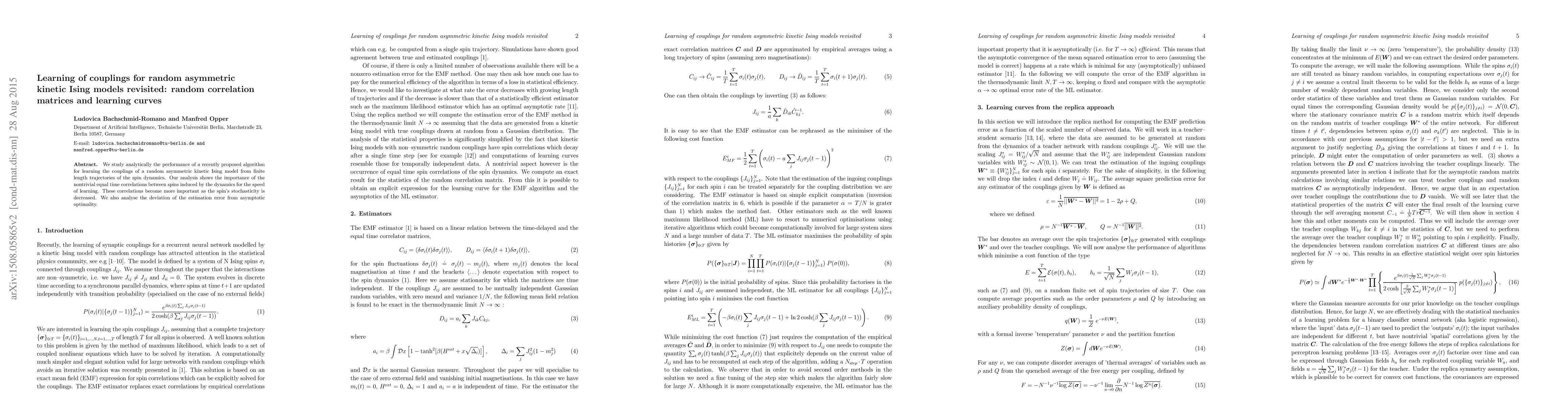 We study analytically the performance of a recently proposed algorithm for learning the couplings of a random asymmetric kinetic Ising model from finite length trajectories of the spin dynamics. Our analysis shows the importance of the nontrivial equal time correlations between spins induced by the dynamics for the speed of learning. These correlations become more important as the spin's stochasticity is decreased. We also analyse the deviation of the estimation error from asymptotic optimality.