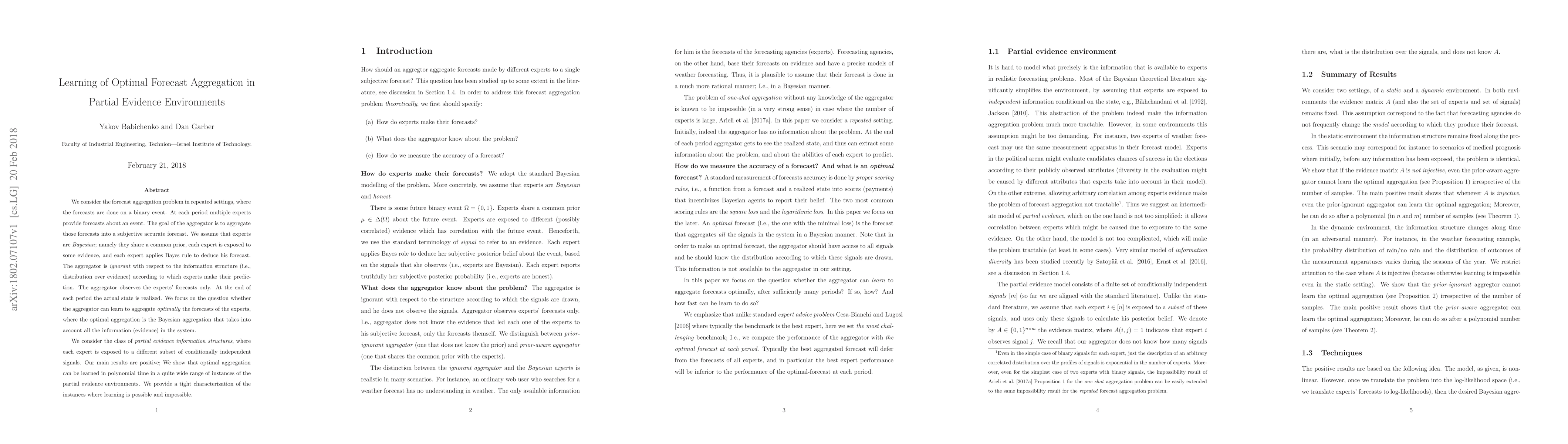 This paper explores the forecast aggregation problem in environments where experts provide partial evidence-based forecasts on a binary event. The aggregator aims to learn optimal Bayesian aggregation in polynomial time, demonstrating that such learning is feasible under certain partial evidence conditions.