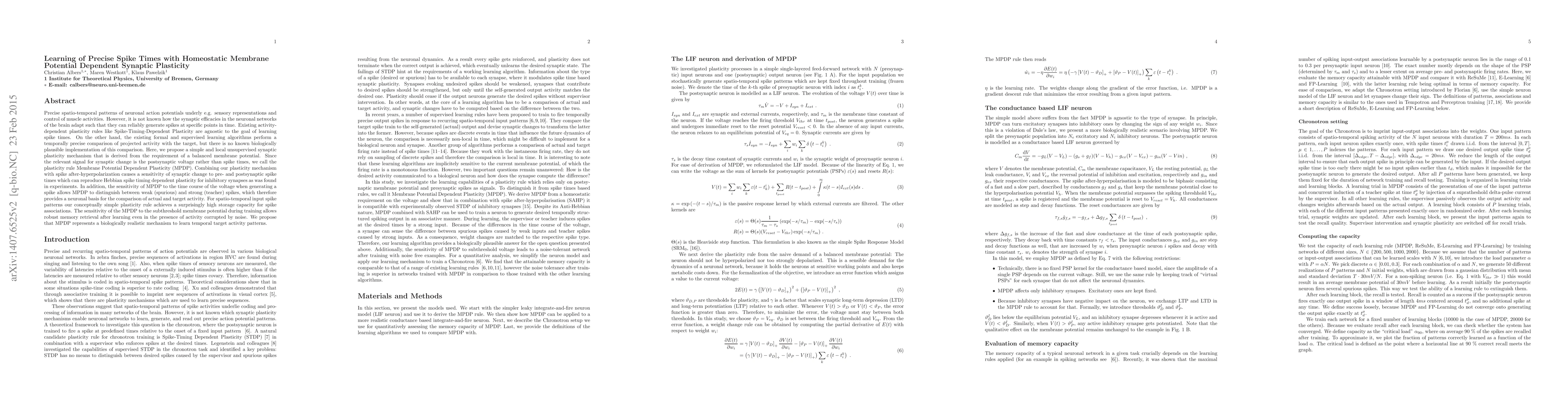 This paper proposes Membrane Potential Dependent Plasticity (MPDP), a local, unsupervised synaptic plasticity mechanism that enables precise learning of spike times based on membrane potential balance. MPDP differentiates between strong and weak spikes, providing a biological basis for precise spike timing and achieving high storage capacity for spike associations, even under noisy conditions.