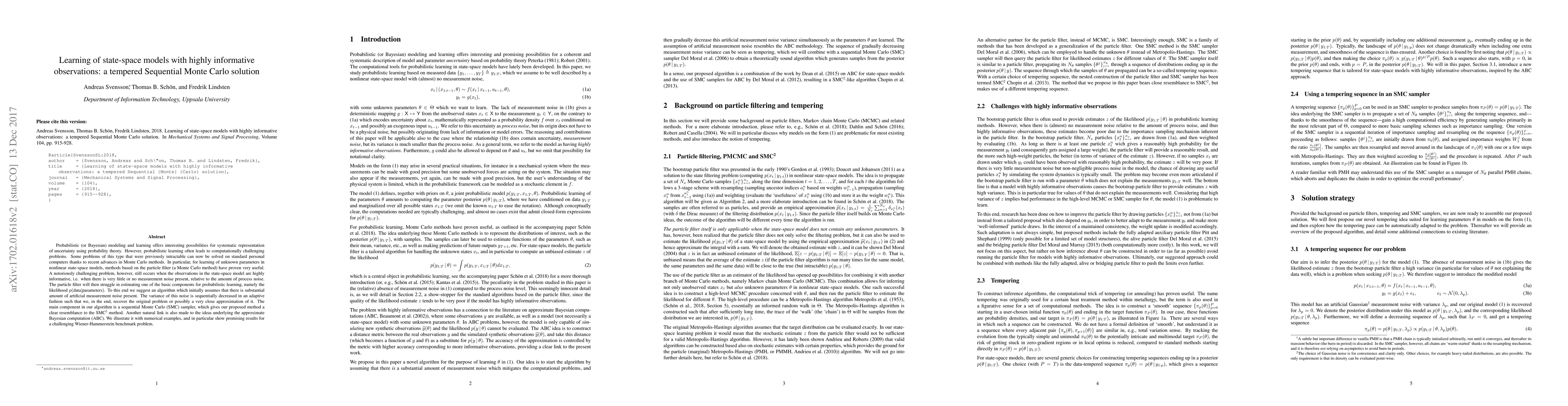 Probabilistic (or Bayesian) modeling and learning offers interesting possibilities for systematic representation of uncertainty using probability theory. However, probabilistic learning often leads to computationally challenging problems. Some problems of this type that were previously intractable can now be solved on standard personal computers thanks to recent advances in Monte Carlo methods. In particular, for learning of unknown parameters in nonlinear state-space models, methods based on the particle filter (a Monte Carlo method) have proven very useful. A notoriously challenging problem, however, still occurs when the observations in the state-space model are highly informative, i.e. when there is very little or no measurement noise present, relative to the amount of process noise. The particle filter will then struggle in estimating one of the basic components for probabilistic learning, namely the likelihood $p($data$|$parameters$)$. To this end we suggest an algorithm which initially assumes that there is substantial amount of artificial measurement noise present. The variance of this noise is sequentially decreased in an adaptive fashion such that we, in the end, recover the original problem or possibly a very close approximation of it. The main component in our algorithm is a sequential Monte Carlo (SMC) sampler, which gives our proposed method a clear resemblance to the SMC^2 method. Another natural link is also made to the ideas underlying the approximate Bayesian computation (ABC). We illustrate it with numerical examples, and in particular show promising results for a challenging Wiener-Hammerstein benchmark problem.