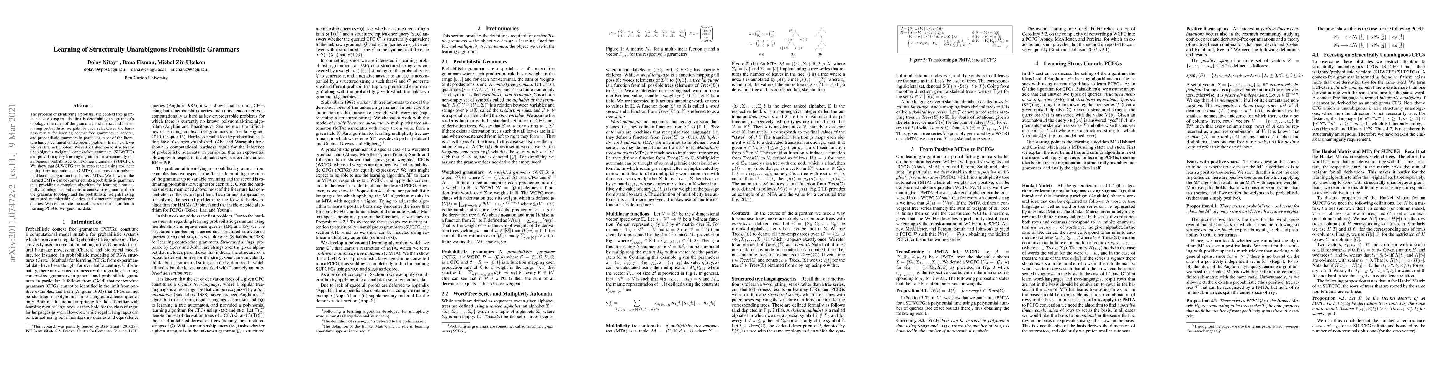 This paper presents a query learning algorithm for structurally unambiguous probabilistic context-free grammars (SUPCFG), focusing on determining grammar topology. It introduces co-linear multiplicity tree automata (CMTA) representation and demonstrates a polynomial learning algorithm for converting CMTAs into probabilistic grammars, showcasing its application in learning PCFGs from genomic data.
