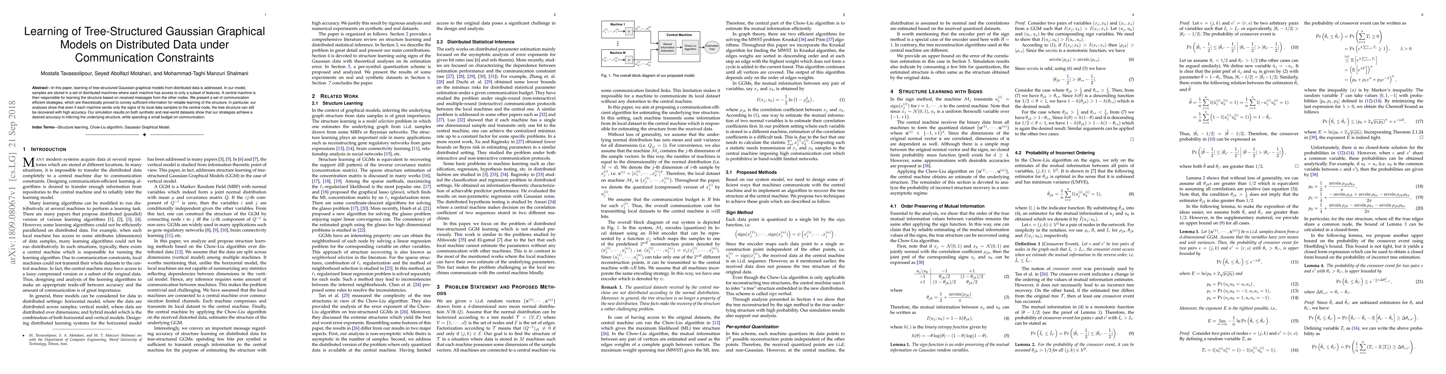 This paper proposes communication-efficient strategies for learning tree-structured Gaussian graphical models from distributed data, where each machine only shares the signs of local data samples. Theoretical proofs and simulations demonstrate high accuracy in structure recovery with minimal communication costs.