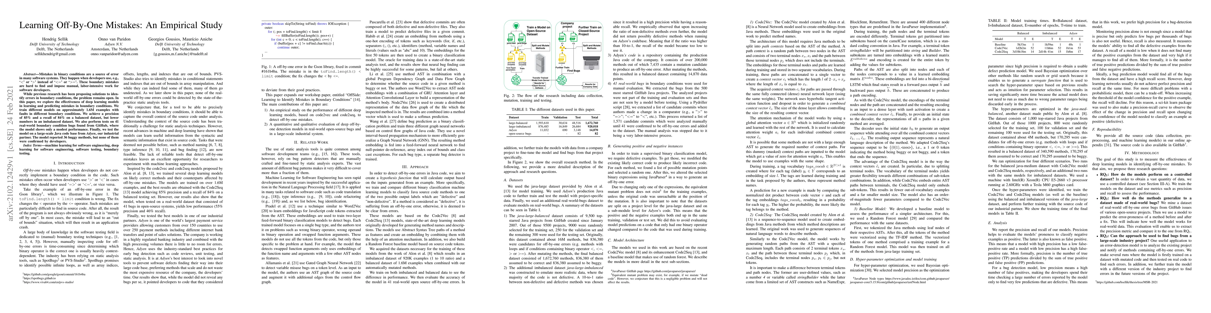 Mistakes in binary conditions are a source of error in many software systems. They happen when developers use, e.g., < or > instead of <= or >=. These boundary mistakes are hard to find and impose manual, labor-intensive work for software developers. While previous research has been proposing solutions to identify errors in boundary conditions, the problem remains open. In this paper, we explore the effectiveness of deep learning models in learning and predicting mistakes in boundary conditions. We train different models on approximately 1.6M examples with faults in different boundary conditions. We achieve a precision of 85% and a recall of 84% on a balanced dataset, but lower numbers in an imbalanced dataset. We also perform tests on 41 real-world boundary condition bugs found from GitHub, where the model shows only a modest performance. Finally, we test the model on a large-scale Java code base from Adyen, our industrial partner. The model reported 36 buggy methods, but none of them were confirmed by developers.