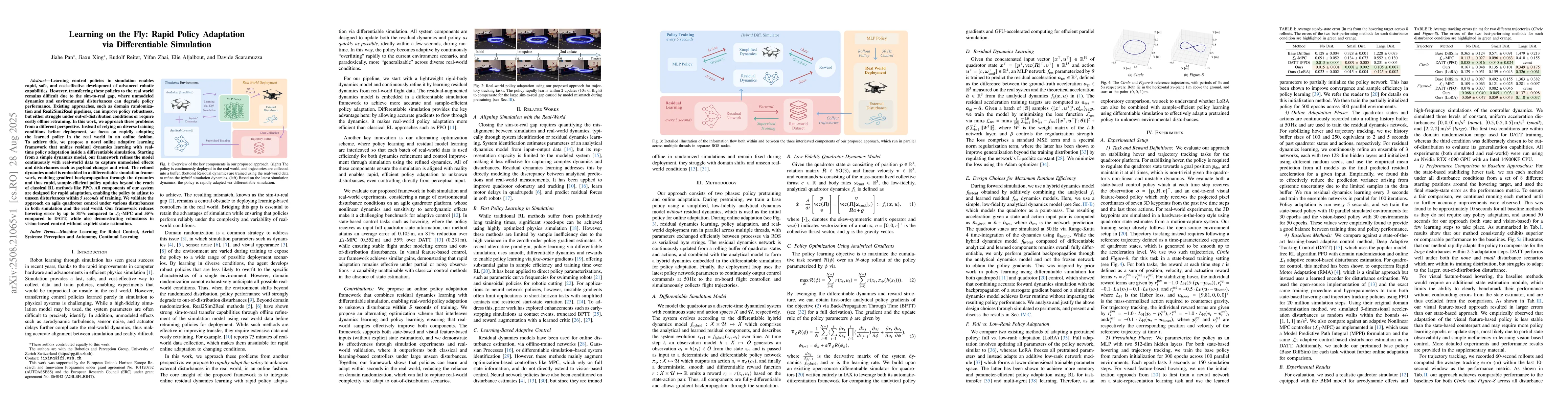 Learning control policies in simulation enables rapid, safe, and cost-effective development of advanced robotic capabilities. However, transferring these policies to the real world remains difficult due to the sim-to-real gap, where unmodeled dynamics and environmental disturbances can degrade policy performance. Existing approaches, such as domain randomization and Real2Sim2Real pipelines, can improve policy robustness, but either struggle under out-of-distribution conditions or require costly offline retraining. In this work, we approach these problems from a different perspective. Instead of relying on diverse training conditions before deployment, we focus on rapidly adapting the learned policy in the real world in an online fashion. To achieve this, we propose a novel online adaptive learning framework that unifies residual dynamics learning with real-time policy adaptation inside a differentiable simulation. Starting from a simple dynamics model, our framework refines the model continuously with real-world data to capture unmodeled effects and disturbances such as payload changes and wind. The refined dynamics model is embedded in a differentiable simulation framework, enabling gradient backpropagation through the dynamics and thus rapid, sample-efficient policy updates beyond the reach of classical RL methods like PPO. All components of our system are designed for rapid adaptation, enabling the policy to adjust to unseen disturbances within 5 seconds of training. We validate the approach on agile quadrotor control under various disturbances in both simulation and the real world. Our framework reduces hovering error by up to 81% compared to L1-MPC and 55% compared to DATT, while also demonstrating robustness in vision-based control without explicit state estimation.