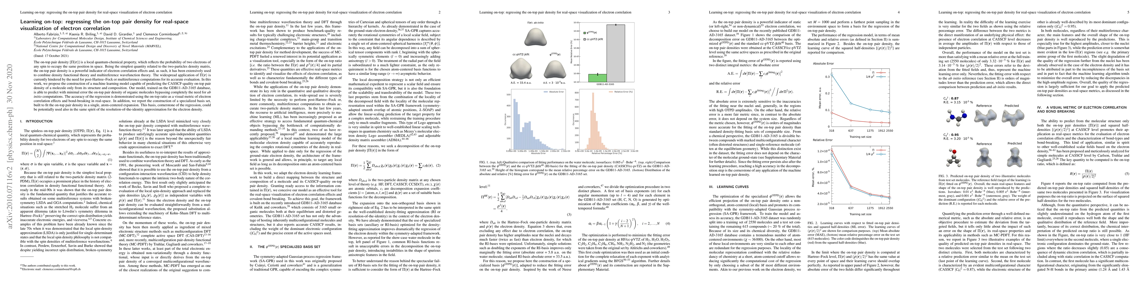 The on-top pair density [$\Pi(\mathrm{\mathbf{r}})$] is a local quantum-chemical property that reflects the probability of two electrons of any spin to occupy the same position in space. Being the simplest quantity related to the two-particle density matrix, the on-top pair density is a powerful indicator of electron correlation effects, and as such, it has been extensively used to combine density functional theory and multireference wavefunction theory. The widespread application of $\Pi(\mathrm{\mathbf{r}})$ is currently hindered by the need for post-Hartree--Fock or multireference computations for its accurate evaluation. In this work, we propose the construction of a machine learning model capable of predicting the CASSCF-quality on-top pair density of a molecule only from its structure and composition. Our model, trained on the GDB11-AD-3165 database, is able to predict with minimal error the on-top pair density of organic molecules, bypassing completely the need for $\textit{ab initio}$ computations. The accuracy of the regression is demonstrated using the on-top ratio as a visual metric of electron correlation effects and bond-breaking in real-space. In addition, we report the construction of a specialized basis set, built to fit the on-top pair density in a single atom-centered expansion. This basis, cornerstone of the regression, could be potentially used also in the same spirit of the resolution-of-the-identity approximation for the electron density.