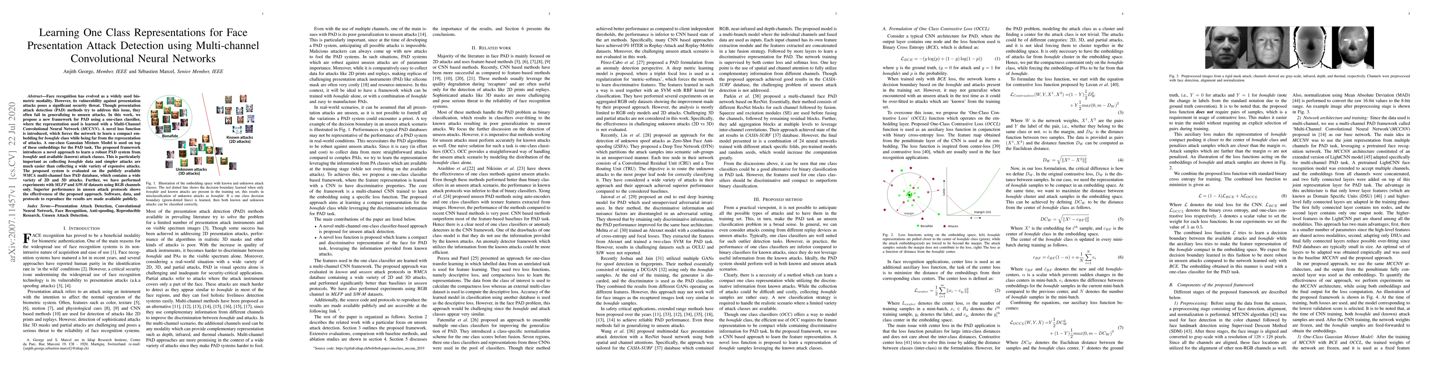 This paper proposes a novel framework for presentation attack detection (PAD) using a one-class classifier with Multi-Channel Convolutional Neural Networks (MCCNN) to learn robust representations. The framework employs a custom loss function to distinguish bonafide faces from attacks, evaluated on multiple datasets showing superior performance against unseen attacks.