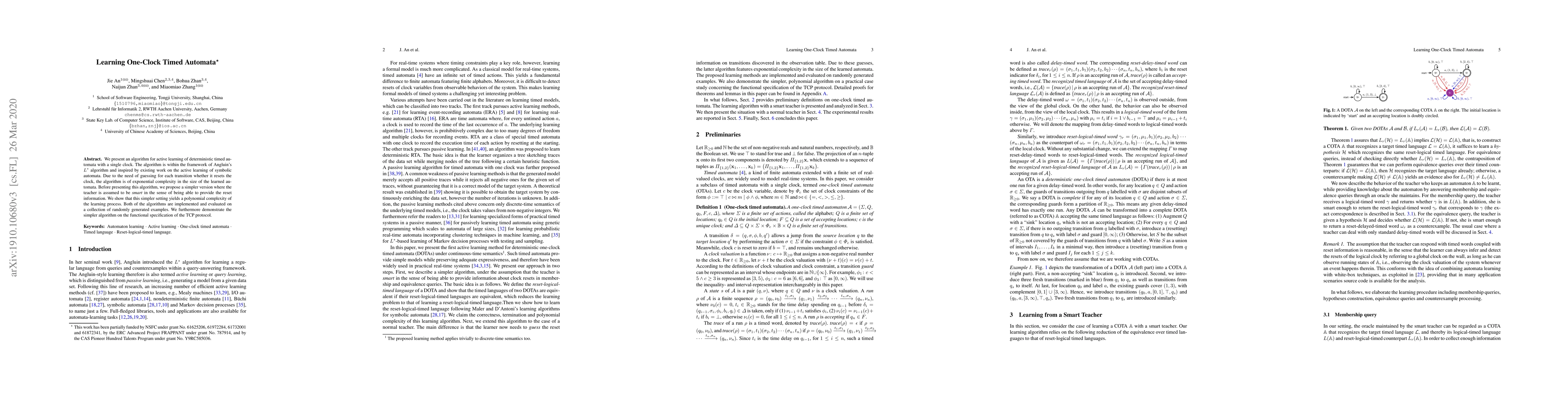 The paper presents an active learning algorithm for deterministic one-clock timed automata (COTAs) under two teacher models: a smart teacher that provides clock reset information and a normal teacher that only provides delay-timed words for membership queries. The algorithm leverages Angluin's L* algorithm framework and extends it to handle timed automata.