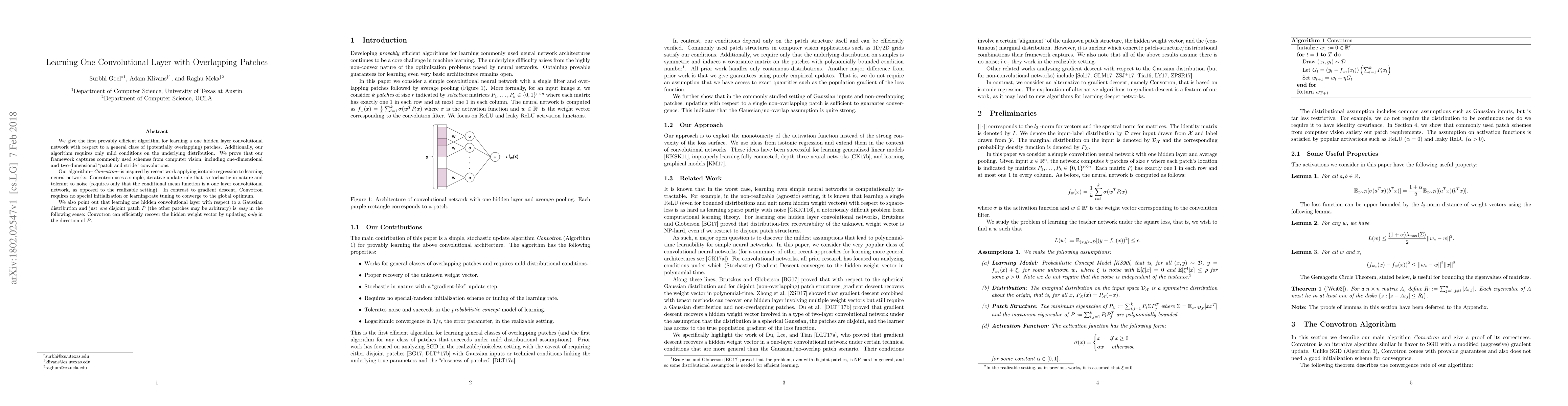 This paper introduces Convotron, a provably efficient algorithm for learning a one-hidden layer convolutional network with overlapping patches, requiring only mild conditions on the underlying distribution. Unlike gradient descent, Convotron does not need special initialization or learning-rate tuning, and it can efficiently recover hidden weights by focusing on a single relevant patch.