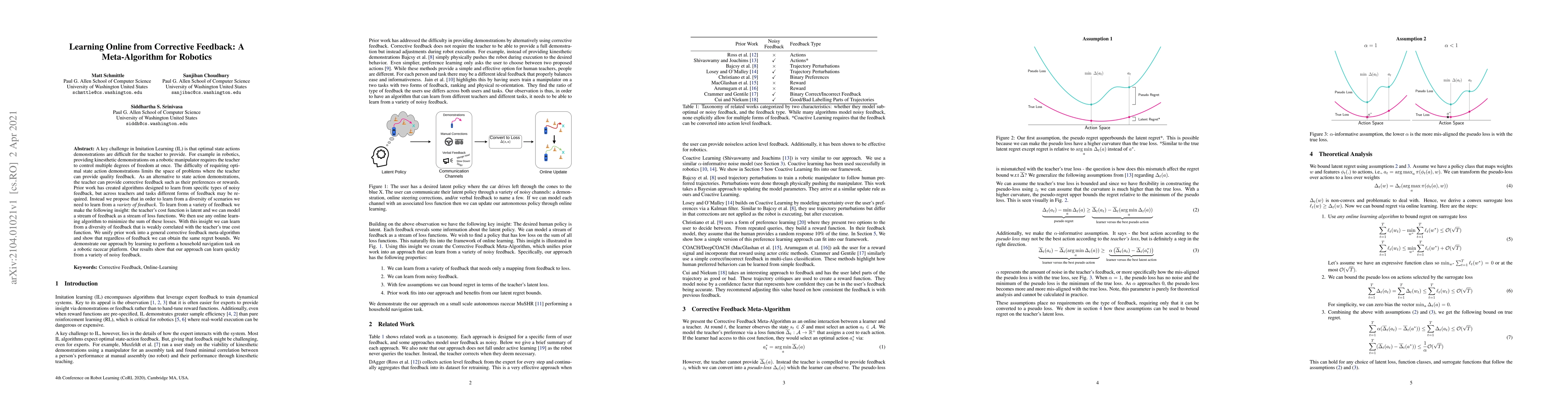 This paper proposes a meta-algorithm for robotics that enables learning from diverse corrective feedback instead of optimal state-action demonstrations, which are difficult to provide. The approach models feedback as a stream of loss functions and uses online learning to minimize these losses, demonstrating effective learning from various feedback forms in a household navigation task on a robotic racecar.