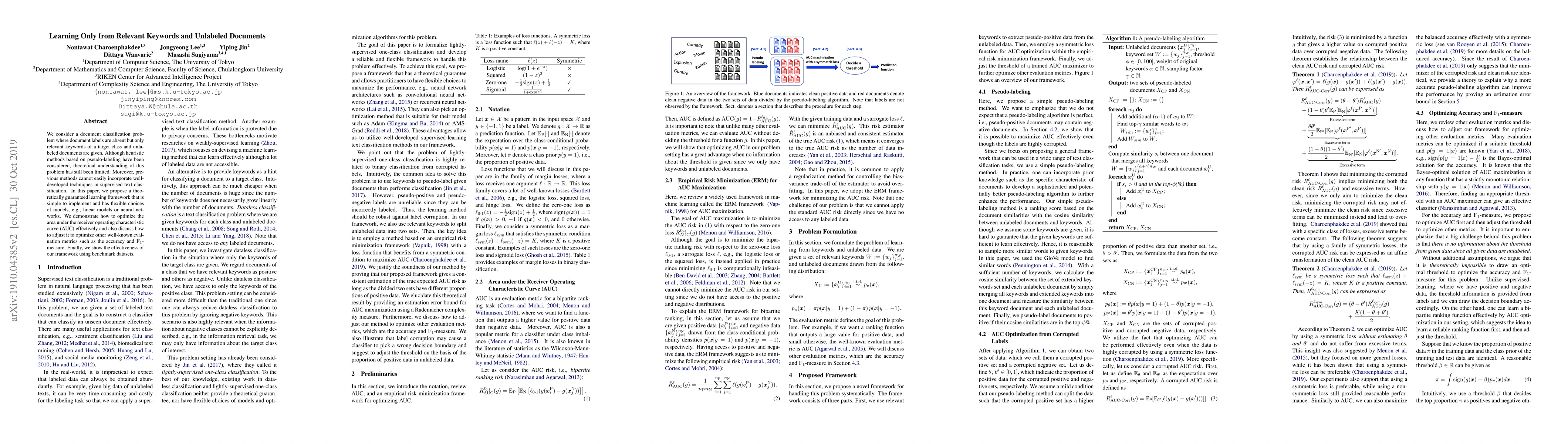 We consider a document classification problem where document labels are absent but only relevant keywords of a target class and unlabeled documents are given. Although heuristic methods based on pseudo-labeling have been considered, theoretical understanding of this problem has still been limited. Moreover, previous methods cannot easily incorporate well-developed techniques in supervised text classification. In this paper, we propose a theoretically guaranteed learning framework that is simple to implement and has flexible choices of models, e.g., linear models or neural networks. We demonstrate how to optimize the area under the receiver operating characteristic curve (AUC) effectively and also discuss how to adjust it to optimize other well-known evaluation metrics such as the accuracy and F1-measure. Finally, we show the effectiveness of our framework using benchmark datasets.