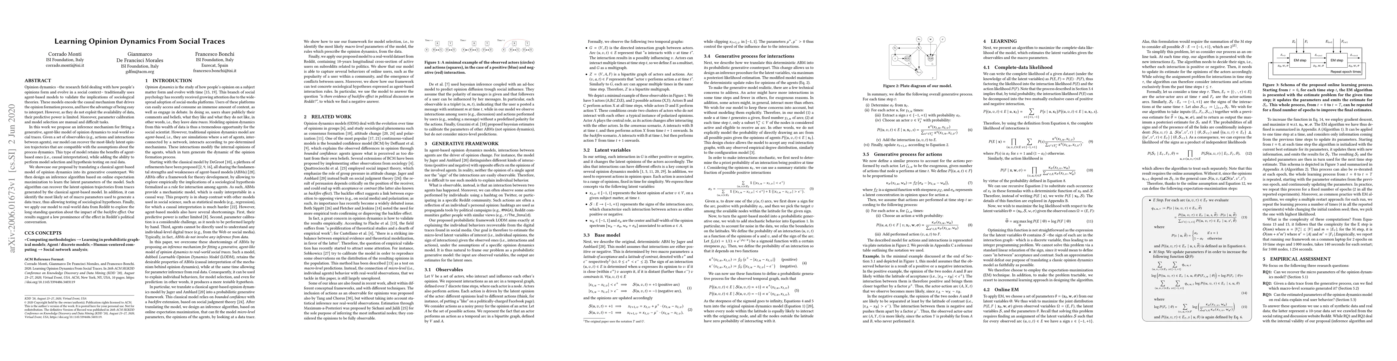 Opinion dynamics - the research field dealing with how people's opinions form and evolve in a social context - traditionally uses agent-based models to validate the implications of sociological theories. These models encode the causal mechanism that drives the opinion formation process, and have the advantage of being easy to interpret. However, as they do not exploit the availability of data, their predictive power is limited. Moreover, parameter calibration and model selection are manual and difficult tasks. In this work we propose an inference mechanism for fitting a generative, agent-like model of opinion dynamics to real-world social traces. Given a set of observables (e.g., actions and interactions between agents), our model can recover the most-likely latent opinion trajectories that are compatible with the assumptions about the process dynamics. This type of model retains the benefits of agent-based ones (i.e., causal interpretation), while adding the ability to perform model selection and hypothesis testing on real data. We showcase our proposal by translating a classical agent-based model of opinion dynamics into its generative counterpart. We then design an inference algorithm based on online expectation maximization to learn the latent parameters of the model. Such algorithm can recover the latent opinion trajectories from traces generated by the classical agent-based model. In addition, it can identify the most likely set of macro parameters used to generate a data trace, thus allowing testing of sociological hypotheses. Finally, we apply our model to real-world data from Reddit to explore the long-standing question about the impact of backfire effect. Our results suggest a low prominence of the effect in Reddit's political conversation.