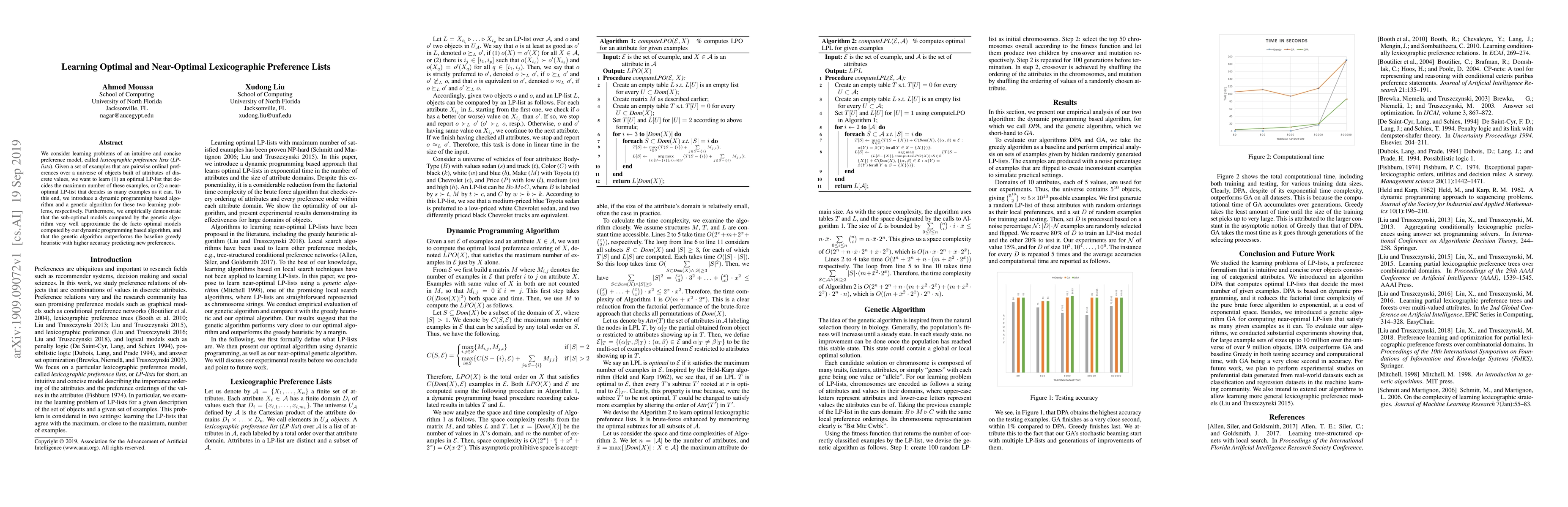 This paper introduces algorithms for learning optimal and near-optimal lexicographic preference lists (LP-lists) from ordinal preference data. It employs a dynamic programming approach for optimal solutions and a genetic algorithm for near-optimal solutions, demonstrating their effectiveness through empirical evaluation.