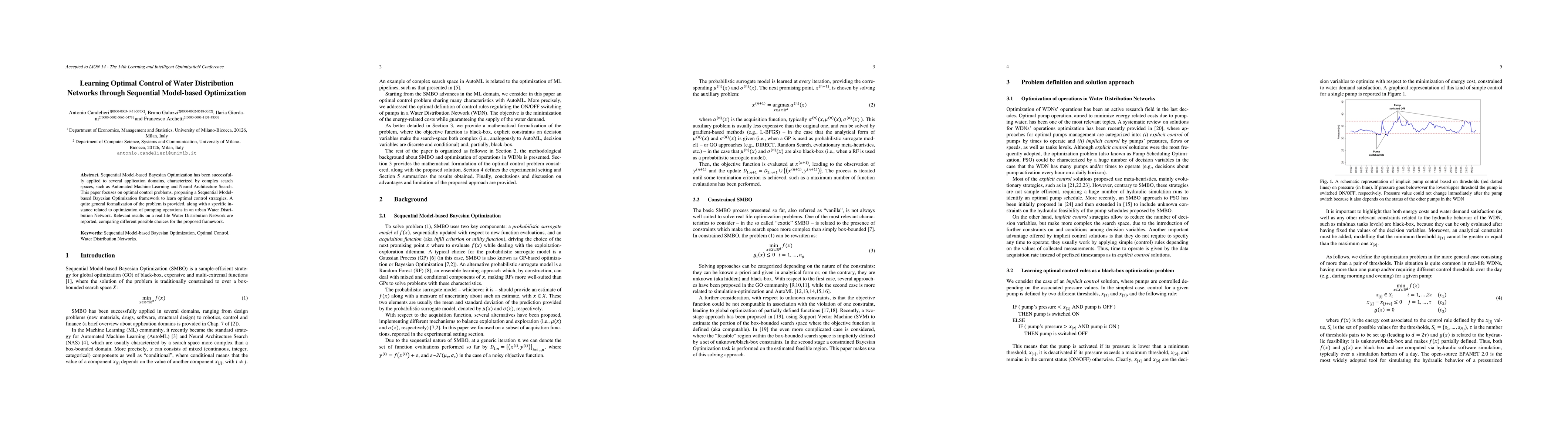 This paper proposes a Sequential Model-based Bayesian Optimization framework to learn optimal control strategies for water distribution networks, specifically focusing on optimizing pumping operations. Results from a real-life network demonstrate the effectiveness of the proposed approach.