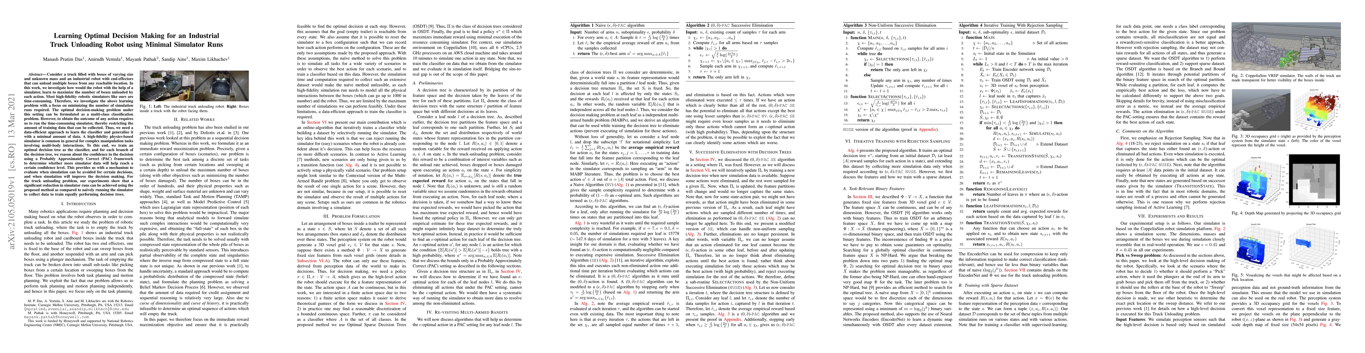 Consider a truck filled with boxes of varying size and unknown mass and an industrial robot with end-effectors that can unload multiple boxes from any reachable location. In this work, we investigate how would the robot with the help of a simulator, learn to maximize the number of boxes unloaded by each action. Most high-fidelity robotic simulators like ours are time-consuming. Therefore, we investigate the above learning problem with a focus on minimizing the number of simulation runs required. The optimal decision-making problem under this setting can be formulated as a multi-class classification problem. However, to obtain the outcome of any action requires us to run the time-consuming simulator, thereby restricting the amount of training data that can be collected. Thus, we need a data-efficient approach to learn the classifier and generalize it with a minimal amount of data. A high-fidelity physics-based simulator is common in general for complex manipulation tasks involving multi-body interactions. To this end, we train an optimal decision tree as the classifier, and for each branch of the decision tree, we reason about the confidence in the decision using a Probably Approximately Correct (PAC) framework to determine whether more simulator data will help reach a certain confidence level. This provides us with a mechanism to evaluate when simulation can be avoided for certain decisions, and when simulation will improve the decision making. For the truck unloading problem, our experiments show that a significant reduction in simulator runs can be achieved using the proposed method as compared to naively running the simulator to collect data to train equally performing decision trees.