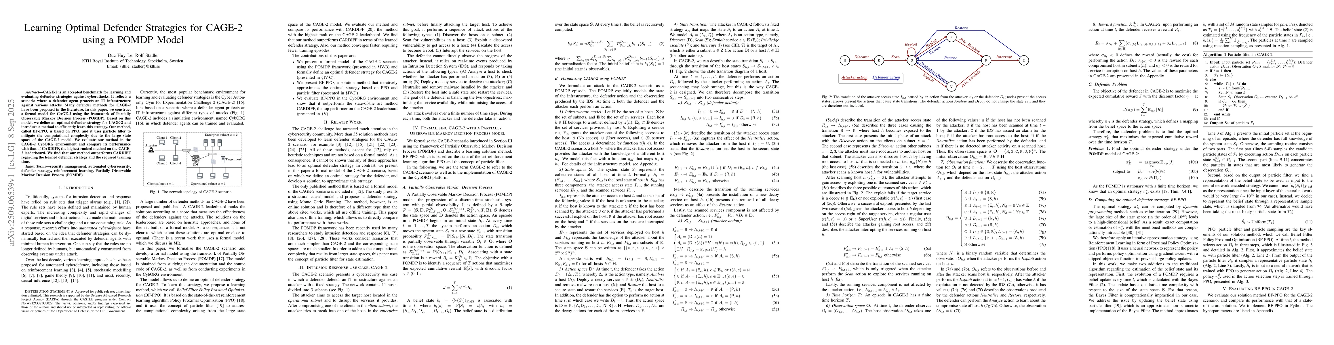 CAGE-2 is an accepted benchmark for learning and evaluating defender strategies against cyberattacks. It reflects a scenario where a defender agent protects an IT infrastructure against various attacks. Many defender methods for CAGE-2 have been proposed in the literature. In this paper, we construct a formal model for CAGE-2 using the framework of Partially Observable Markov Decision Process (POMDP). Based on this model, we define an optimal defender strategy for CAGE-2 and introduce a method to efficiently learn this strategy. Our method, called BF-PPO, is based on PPO, and it uses particle filter to mitigate the computational complexity due to the large state space of the CAGE-2 model. We evaluate our method in the CAGE-2 CybORG environment and compare its performance with that of CARDIFF, the highest ranked method on the CAGE-2 leaderboard. We find that our method outperforms CARDIFF regarding the learned defender strategy and the required training time.