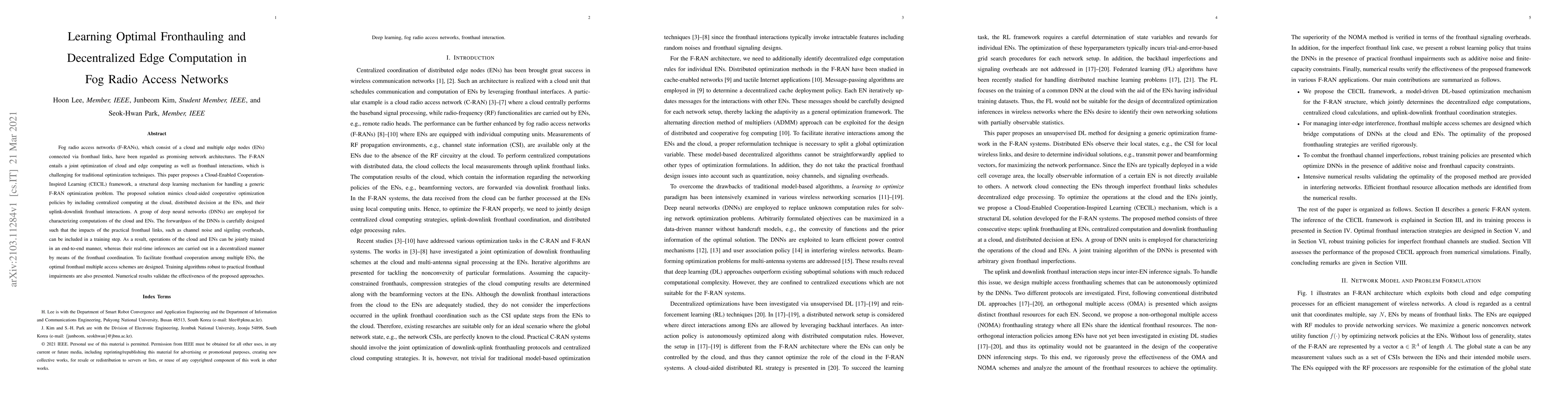 Fog radio access networks (F-RANs), which consist of a cloud and multiple edge nodes (ENs) connected via fronthaul links, have been regarded as promising network architectures. The F-RAN entails a joint optimization of cloud and edge computing as well as fronthaul interactions, which is challenging for traditional optimization techniques. This paper proposes a Cloud-Enabled Cooperation-Inspired Learning (CECIL) framework, a structural deep learning mechanism for handling a generic F-RAN optimization problem. The proposed solution mimics cloud-aided cooperative optimization policies by including centralized computing at the cloud, distributed decision at the ENs, and their uplink-downlink fronthaul interactions. A group of deep neural networks (DNNs) are employed for characterizing computations of the cloud and ENs. The forwardpass of the DNNs is carefully designed such that the impacts of the practical fronthaul links, such as channel noise and signling overheads, can be included in a training step. As a result, operations of the cloud and ENs can be jointly trained in an end-to-end manner, whereas their real-time inferences are carried out in a decentralized manner by means of the fronthaul coordination. To facilitate fronthaul cooperation among multiple ENs, the optimal fronthaul multiple access schemes are designed. Training algorithms robust to practical fronthaul impairments are also presented. Numerical results validate the effectiveness of the proposed approaches.