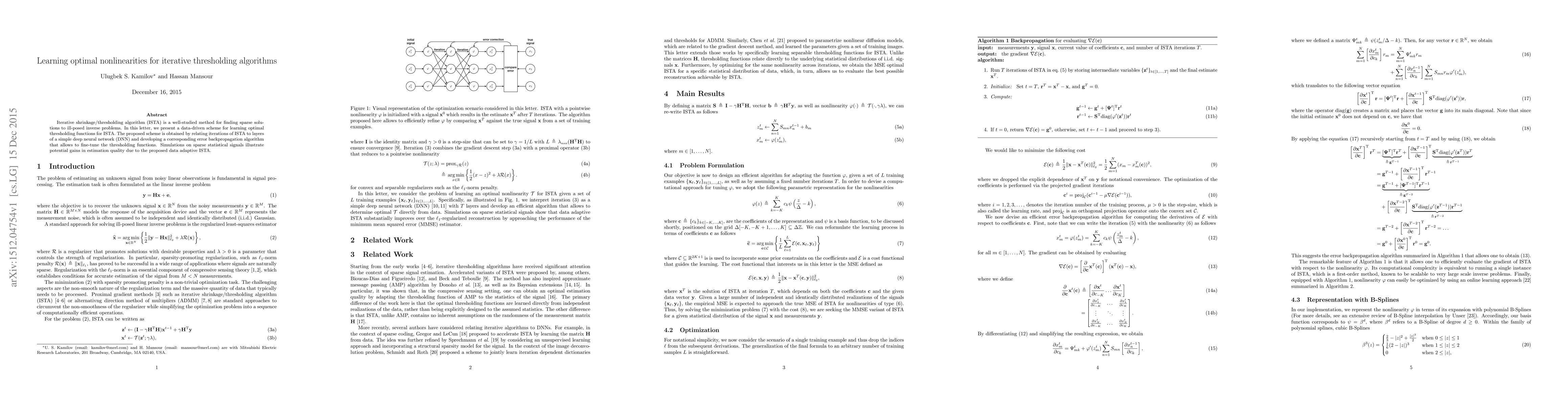 This paper proposes a data-driven method to learn optimal nonlinear thresholding functions for iterative shrinkage/thresholding algorithms (ISTA) by relating ISTA iterations to a deep neural network and using error backpropagation for fine-tuning. Simulation results show improved estimation quality for sparse signals using the adaptive ISTA approach.
