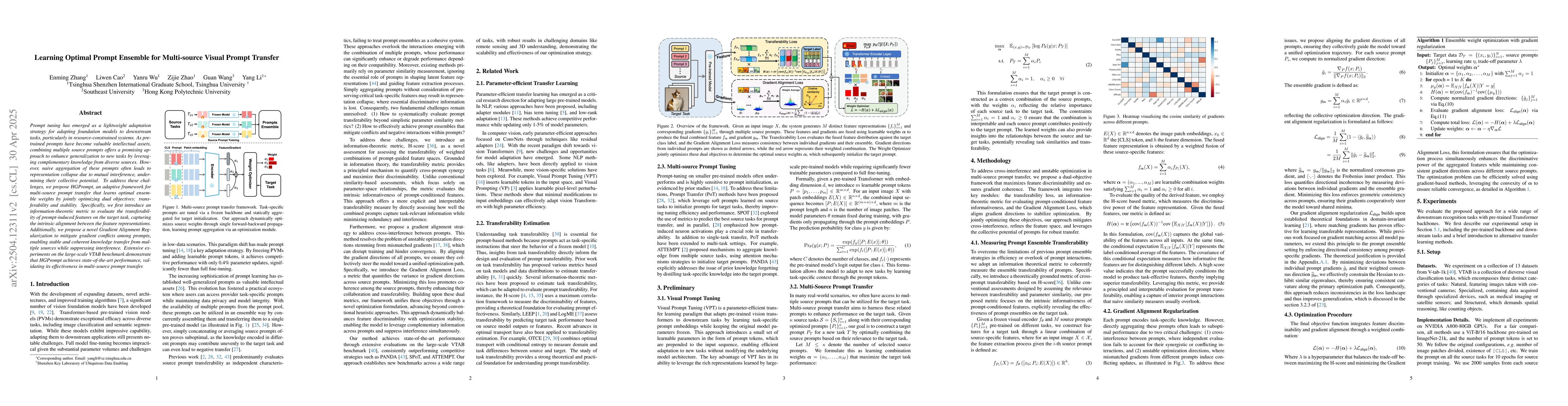 The research proposes HGPrompt, an adaptive framework for multi-source prompt transfer that learns optimal ensemble weights by jointly optimizing dual objectives: transferability and stability. It introduces an information-theoretic metric for evaluating prompt-induced feature transferability and a Gradient Alignment Regularization to mitigate gradient conflicts among prompts.