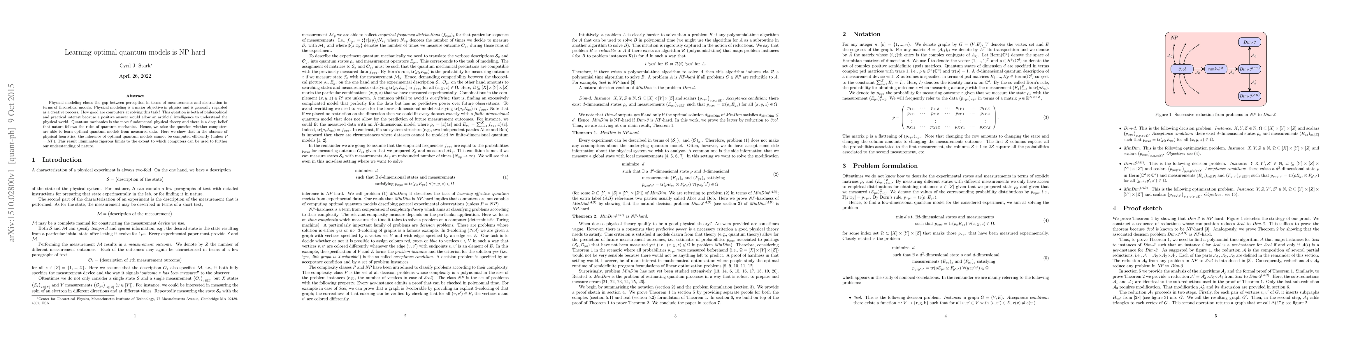 The paper presents reductions from the 3-coloring problem to demonstrate NP-hardness for inferring quantum models, providing a rigorous theoretical framework for understanding the limits of computational methods in quantum physics.