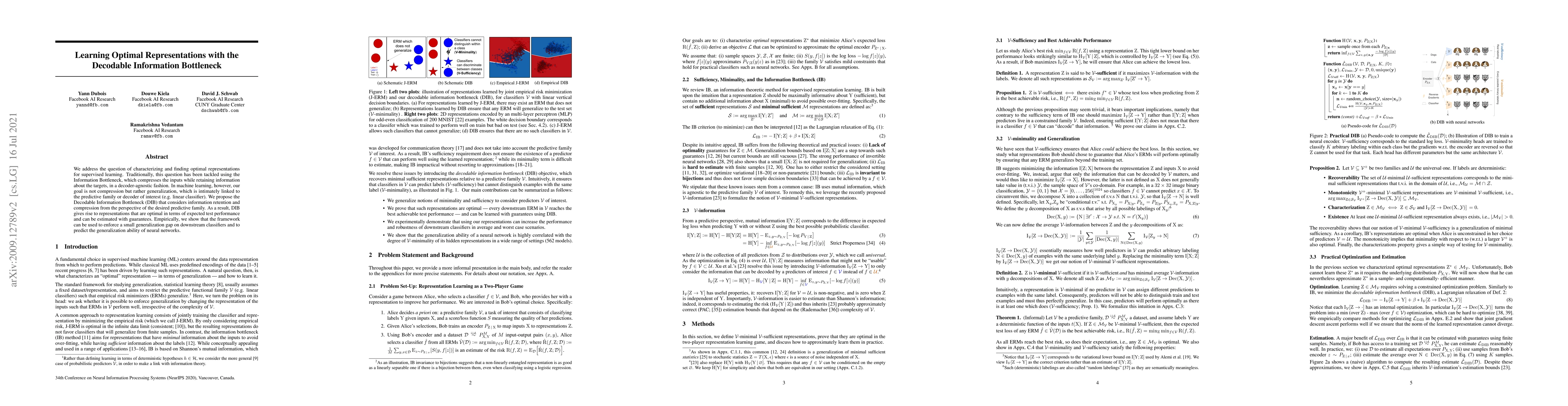We address the question of characterizing and finding optimal representations for supervised learning. Traditionally, this question has been tackled using the Information Bottleneck, which compresses the inputs while retaining information about the targets, in a decoder-agnostic fashion. In machine learning, however, our goal is not compression but rather generalization, which is intimately linked to the predictive family or decoder of interest (e.g. linear classifier). We propose the Decodable Information Bottleneck (DIB) that considers information retention and compression from the perspective of the desired predictive family. As a result, DIB gives rise to representations that are optimal in terms of expected test performance and can be estimated with guarantees. Empirically, we show that the framework can be used to enforce a small generalization gap on downstream classifiers and to predict the generalization ability of neural networks.