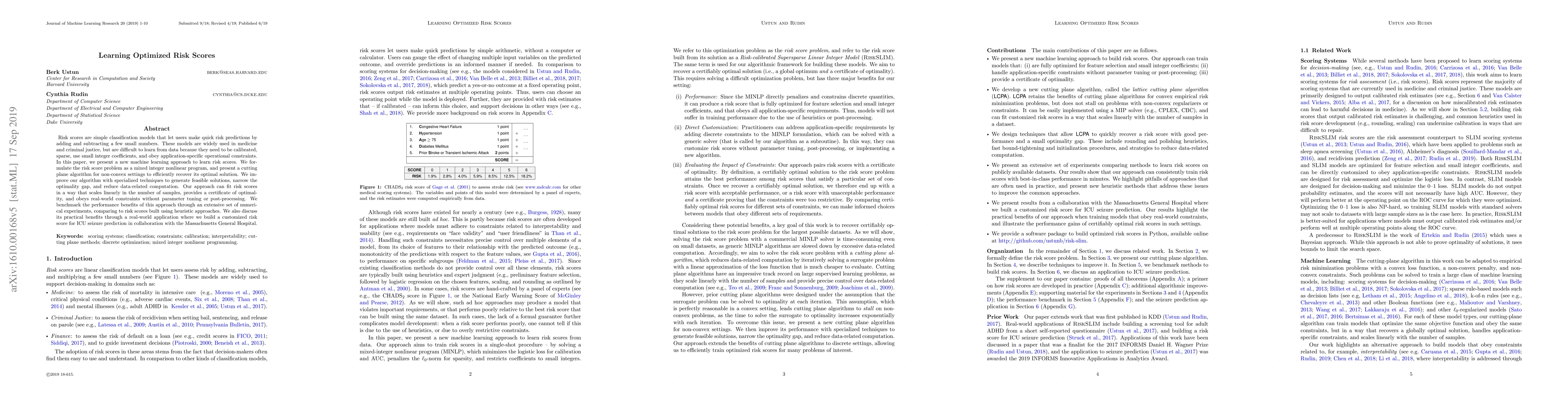 This paper introduces a novel machine learning method to optimize risk scores, formulated as a mixed integer nonlinear program, employing a cutting plane algorithm to efficiently find optimal solutions. The approach scales linearly with data, provides optimality certificates, and adheres to real-world constraints without additional tuning.