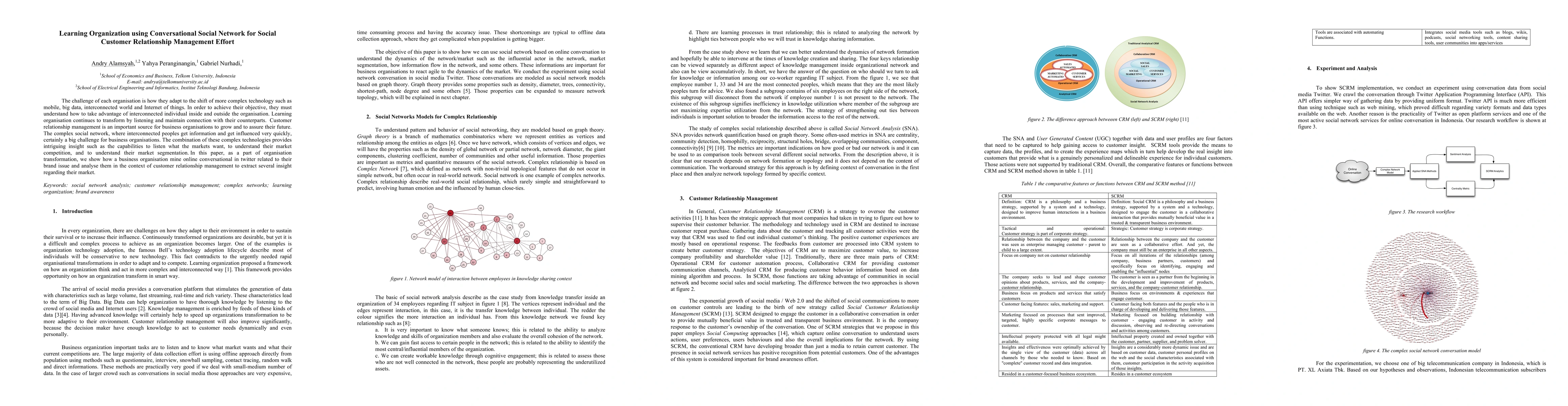 The challenge of each organization is how they adapt to the shift of more complex technology such as mobile, big data, interconnected world, and the Internet of things. In order to achieve their objective, they must understand how to take advantage of the interconnected individuals inside and outside the organization. Learning organization continues to transform by listening and maintain the connection with their counterparts. Customer relationship management is an important source for business organizations to grow and to assure their future. The complex social network, where interconnected peoples get information and get influenced very quickly, certainly a big challenge for business organizations. The combination of these complex technologies provides intriguing insight such as the capabilities to listen to what the markets want, to understand their market competition, and to understand their market segmentation. In this paper, as a part of organization transformation, we show how a business organization mine online conversational in Twitter related to their brand issue and analyze them in the context of customer relationship management to extract several insights regarding their market.