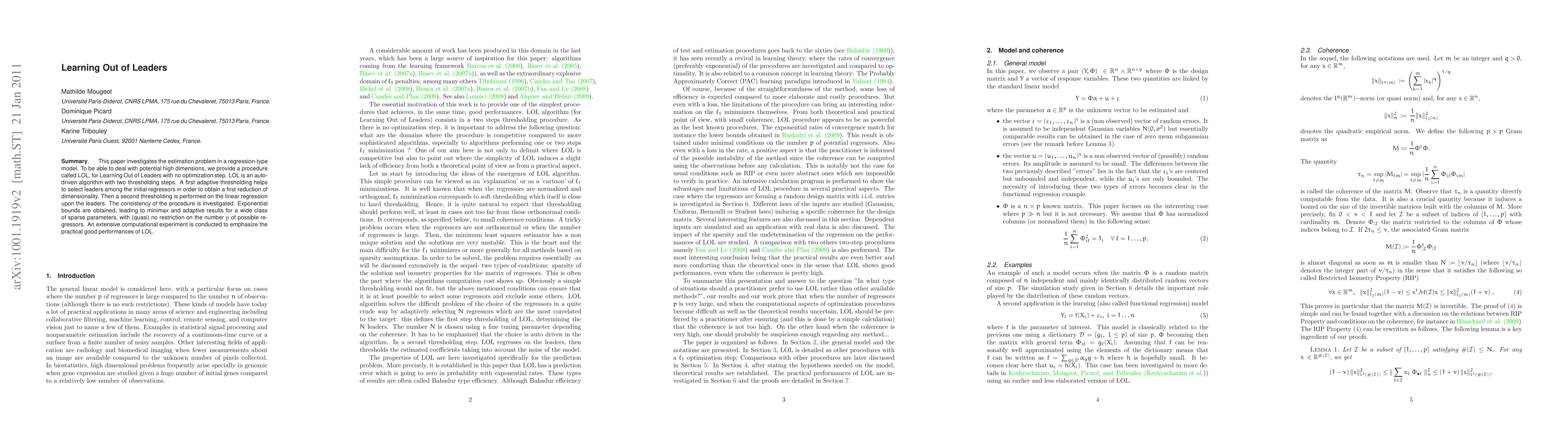 This paper investigates the estimation problem in a regression-type model. To be able to deal with potential high dimensions, we provide a procedure called LOL, for Learning Out of Leaders with no optimization step. LOL is an auto-driven algorithm with two thresholding steps. A first adaptive thresholding helps to select leaders among the initial regressors in order to obtain a first reduction of dimensionality. Then a second thresholding is performed on the linear regression upon the leaders. The consistency of the procedure is investigated. Exponential bounds are obtained, leading to minimax and adaptive results for a wide class of sparse parameters, with (quasi) no restriction on the number p of possible regressors. An extensive computational experiment is conducted to emphasize the practical good performances of LOL.