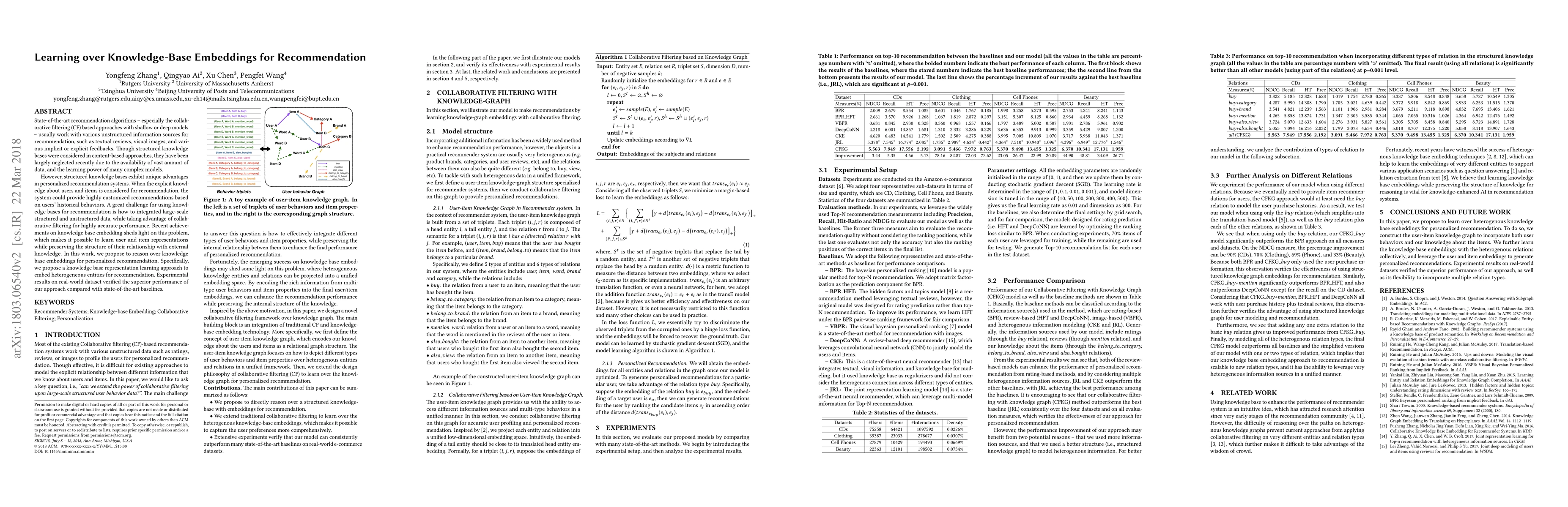 This paper proposes a method to integrate knowledge base embeddings into recommendation systems for personalized suggestions, leveraging both structured knowledge bases and collaborative filtering techniques. Experimental results show that this approach outperforms existing baselines in providing highly accurate and customized recommendations.