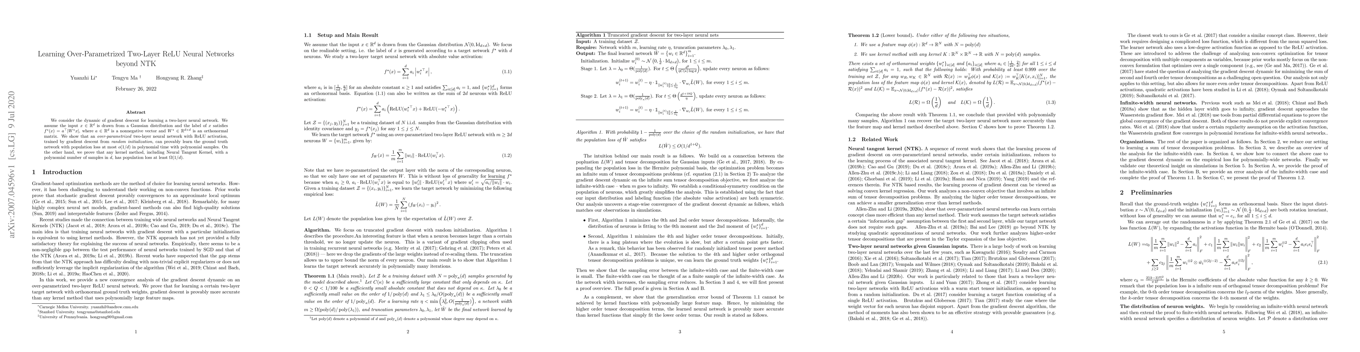 We consider the dynamic of gradient descent for learning a two-layer neural network. We assume the input $x\in\mathbb{R}^d$ is drawn from a Gaussian distribution and the label of $x$ satisfies $f^{\star}(x) = a^{\top}|W^{\star}x|$, where $a\in\mathbb{R}^d$ is a nonnegative vector and $W^{\star} \in\mathbb{R}^{d\times d}$ is an orthonormal matrix. We show that an over-parametrized two-layer neural network with ReLU activation, trained by gradient descent from random initialization, can provably learn the ground truth network with population loss at most $o(1/d)$ in polynomial time with polynomial samples. On the other hand, we prove that any kernel method, including Neural Tangent Kernel, with a polynomial number of samples in $d$, has population loss at least $\Omega(1 / d)$.
