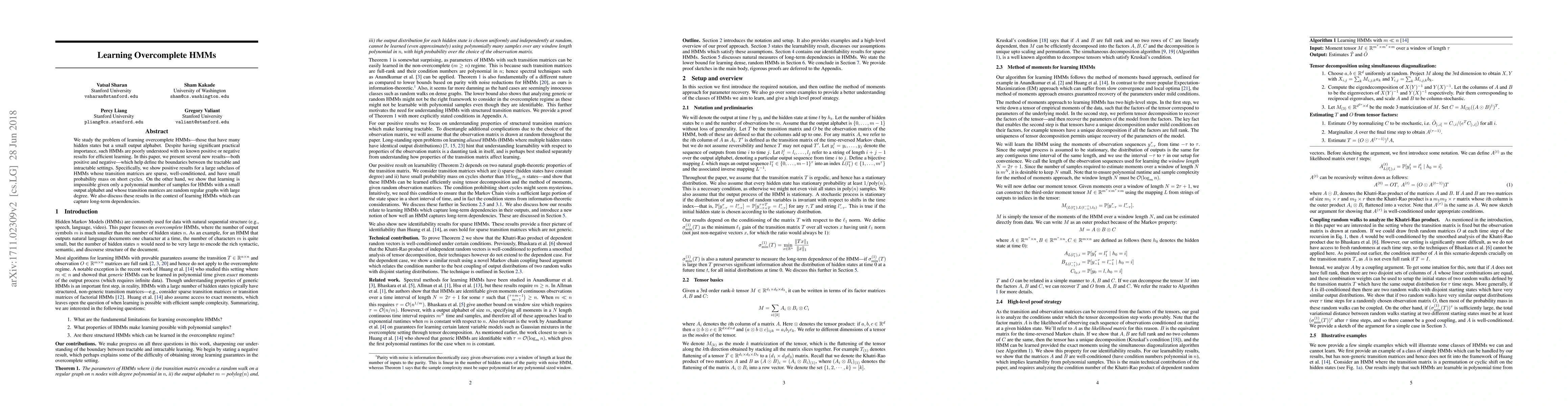 Researchers studied learning overcomplete Hidden Markov Models (HMMs) with many hidden states but a small output alphabet. They found that HMMs with sparse, well-conditioned transition matrices can be learned efficiently, while those with random regular graphs cannot be learned from a limited number of samples.