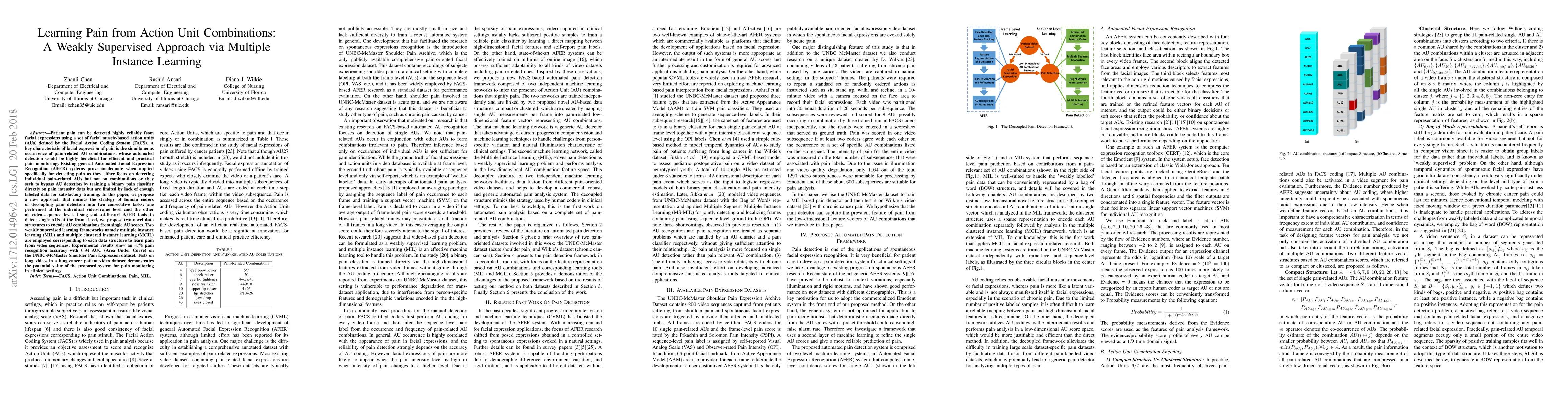 This paper proposes a weakly supervised approach using multiple instance learning to detect pain from facial expressions by identifying combinations of action units (AUs) rather than individual AUs. The method achieves 87% accuracy and a 0.94 AUC score on a shoulder pain dataset, demonstrating its potential for clinical pain monitoring.
