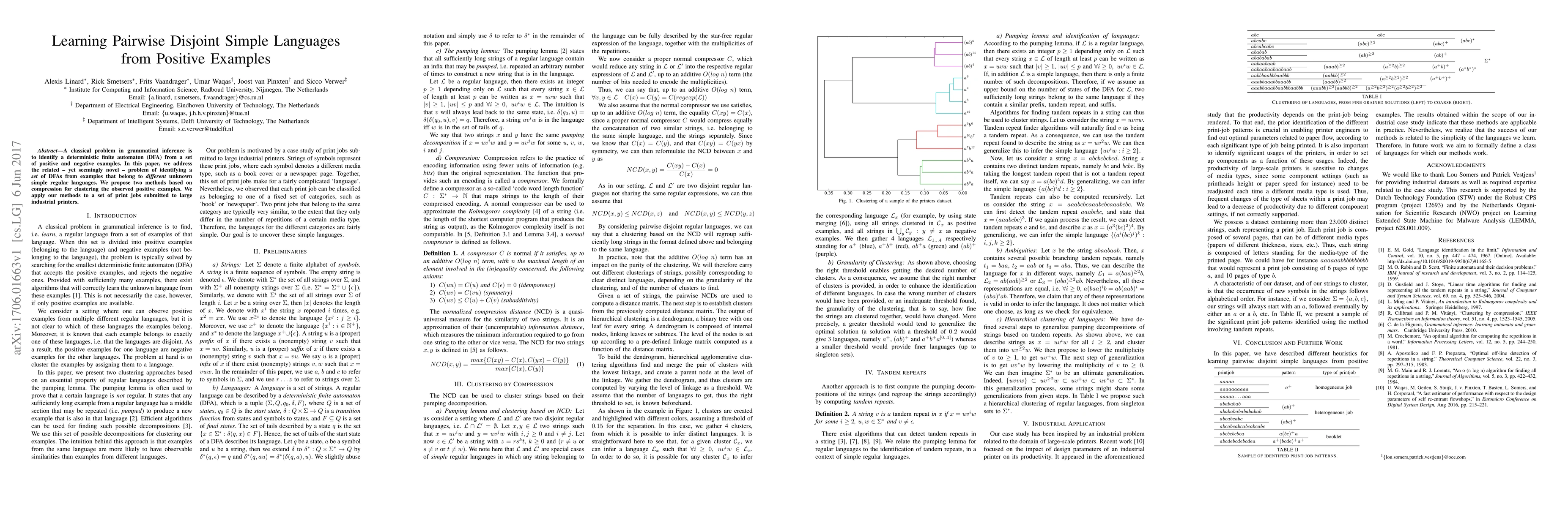 This paper proposes two compression-based methods for identifying disjoint simple regular languages from positive examples, aiming to cluster observed data into distinct deterministic finite automata. The methods are tested on print jobs from large industrial printers.