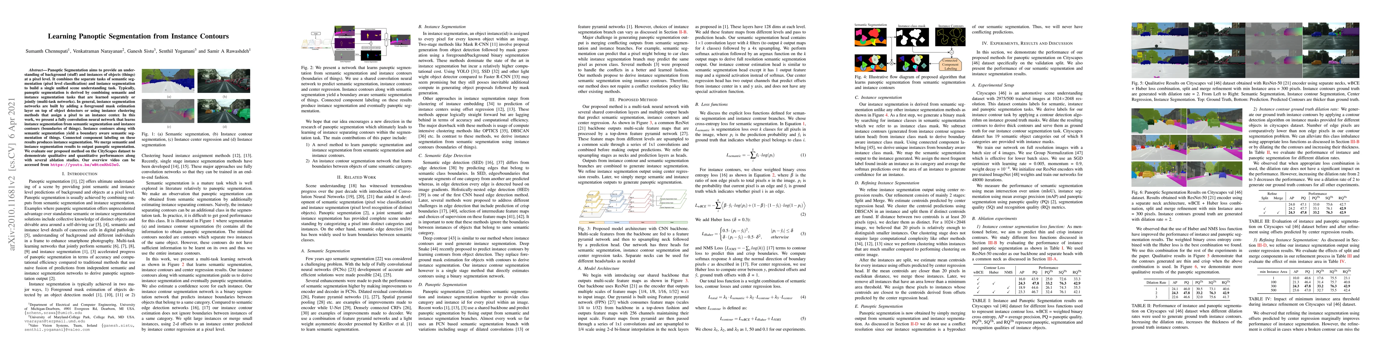 This paper proposes a fully convolutional neural network that learns panoptic segmentation by combining semantic segmentation and instance contours. The method leverages instance contours to produce boundary-aware semantic segmentation and uses connected component labeling to derive instance segmentation, ultimately merging both to achieve panoptic segmentation. The approach is evaluated on the CityScapes dataset with both qualitative and quantitative assessments.