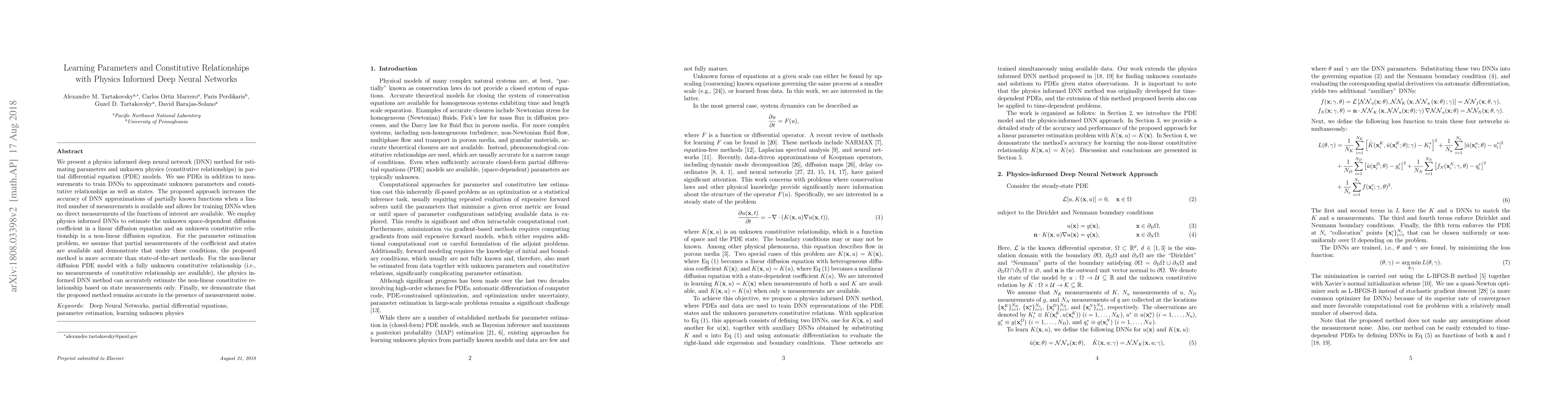 We present a physics informed deep neural network (DNN) method for estimating parameters and unknown physics (constitutive relationships) in partial differential equation (PDE) models. We use PDEs in addition to measurements to train DNNs to approximate unknown parameters and constitutive relationships as well as states. The proposed approach increases the accuracy of DNN approximations of partially known functions when a limited number of measurements is available and allows for training DNNs when no direct measurements of the functions of interest are available. We employ physics informed DNNs to estimate the unknown space-dependent diffusion coefficient in a linear diffusion equation and an unknown constitutive relationship in a non-linear diffusion equation. For the parameter estimation problem, we assume that partial measurements of the coefficient and states are available and demonstrate that under these conditions, the proposed method is more accurate than state-of-the-art methods. For the non-linear diffusion PDE model with a fully unknown constitutive relationship (i.e., no measurements of constitutive relationship are available), the physics informed DNN method can accurately estimate the non-linear constitutive relationship based on state measurements only. Finally, we demonstrate that the proposed method remains accurate in the presence of measurement noise.