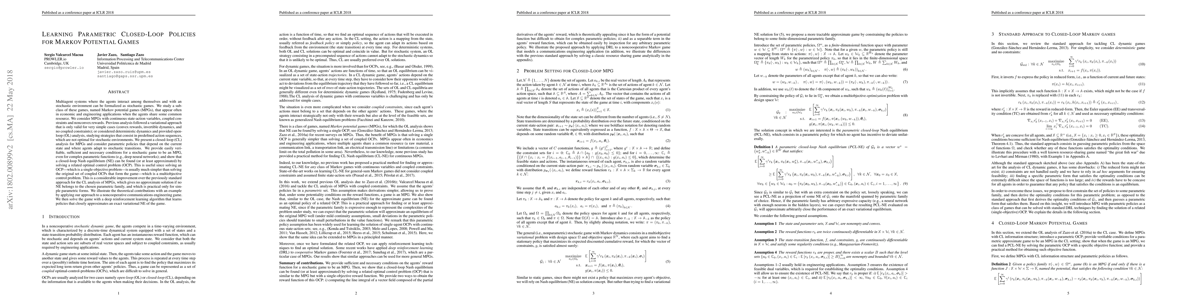 Multiagent systems where agents interact among themselves and with a stochastic environment can be formalized as stochastic games. We study a subclass named Markov potential games (MPGs) that appear often in economic and engineering applications when the agents share a common resource. We consider MPGs with continuous state-action variables, coupled constraints and nonconvex rewards. Previous analysis followed a variational approach that is only valid for very simple cases (convex rewards, invertible dynamics, and no coupled constraints); or considered deterministic dynamics and provided open-loop (OL) analysis, studying strategies that consist in predefined action sequences, which are not optimal for stochastic environments. We present a closed-loop (CL) analysis for MPGs and consider parametric policies that depend on the current state. We provide easily verifiable, sufficient and necessary conditions for a stochastic game to be an MPG, even for complex parametric functions (e.g., deep neural networks); and show that a closed-loop Nash equilibrium (NE) can be found (or at least approximated) by solving a related optimal control problem (OCP). This is useful since solving an OCP--which is a single-objective problem--is usually much simpler than solving the original set of coupled OCPs that form the game--which is a multiobjective control problem. This is a considerable improvement over the previously standard approach for the CL analysis of MPGs, which gives no approximate solution if no NE belongs to the chosen parametric family, and which is practical only for simple parametric forms. We illustrate the theoretical contributions with an example by applying our approach to a noncooperative communications engineering game. We then solve the game with a deep reinforcement learning algorithm that learns policies that closely approximates an exact variational NE of the game.
