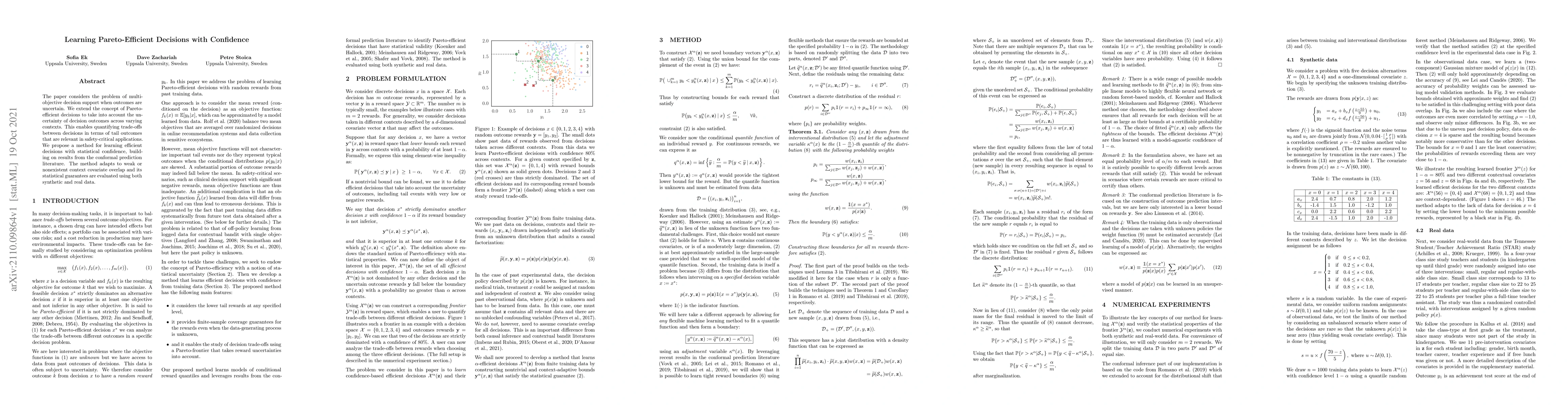 This paper proposes a method for learning Pareto-efficient decisions under uncertainty, adapting to contexts with little covariate overlap, and provides statistical confidence in the outcomes, evaluated through synthetic and real data. The approach quantifies trade-offs in safety-critical applications using tail outcomes.
