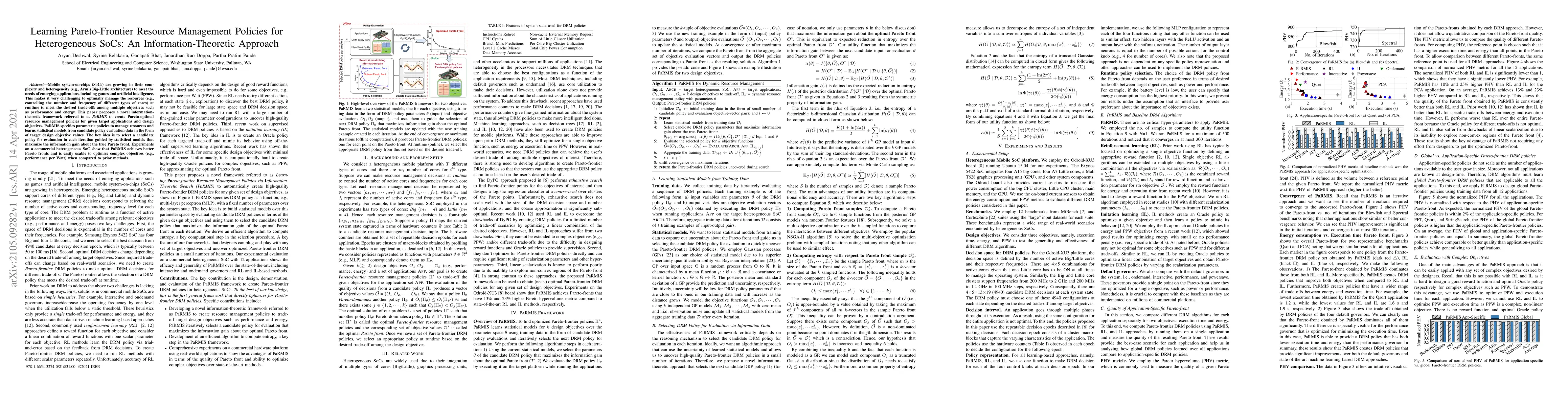 Mobile system-on-chips (SoCs) are growing in their complexity and heterogeneity (e.g., Arm's Big-Little architecture) to meet the needs of emerging applications, including games and artificial intelligence. This makes it very challenging to optimally manage the resources (e.g., controlling the number and frequency of different types of cores) at runtime to meet the desired trade-offs among multiple objectives such as performance and energy. This paper proposes a novel information-theoretic framework referred to as PaRMIS to create Pareto-optimal resource management policies for given target applications and design objectives. PaRMIS specifies parametric policies to manage resources and learns statistical models from candidate policy evaluation data in the form of target design objective values. The key idea is to select a candidate policy for evaluation in each iteration guided by statistical models that maximize the information gain about the true Pareto front. Experiments on a commercial heterogeneous SoC show that PaRMIS achieves better Pareto fronts and is easily usable to optimize complex objectives (e.g., performance per Watt) when compared to prior methods.