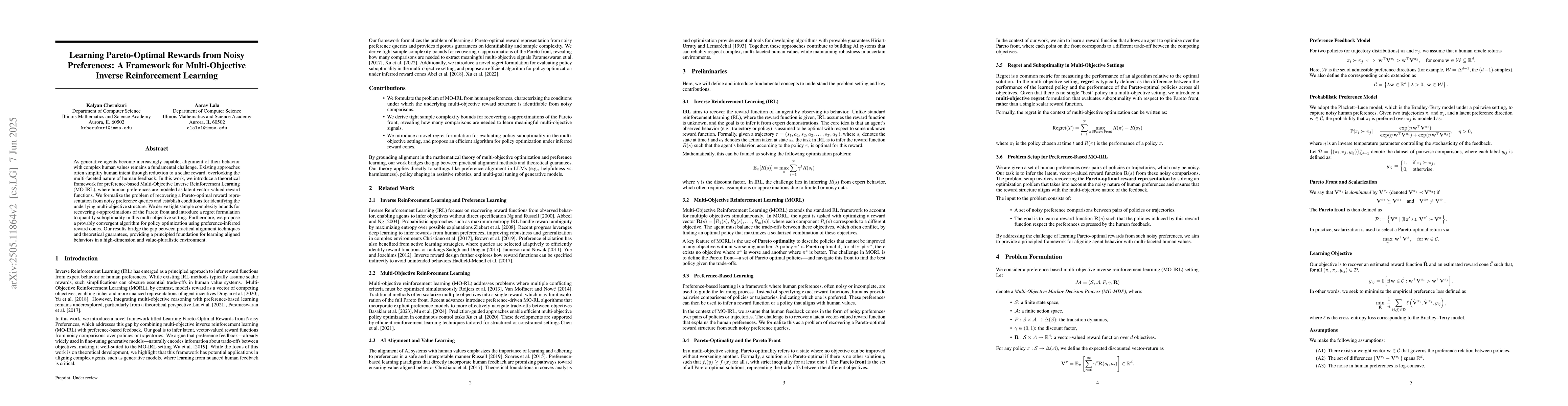This paper introduces a framework for Multi-Objective Inverse Reinforcement Learning that learns Pareto-optimal rewards from noisy human preferences, providing a principled foundation for learning aligned behaviors in high-dimensional environments.