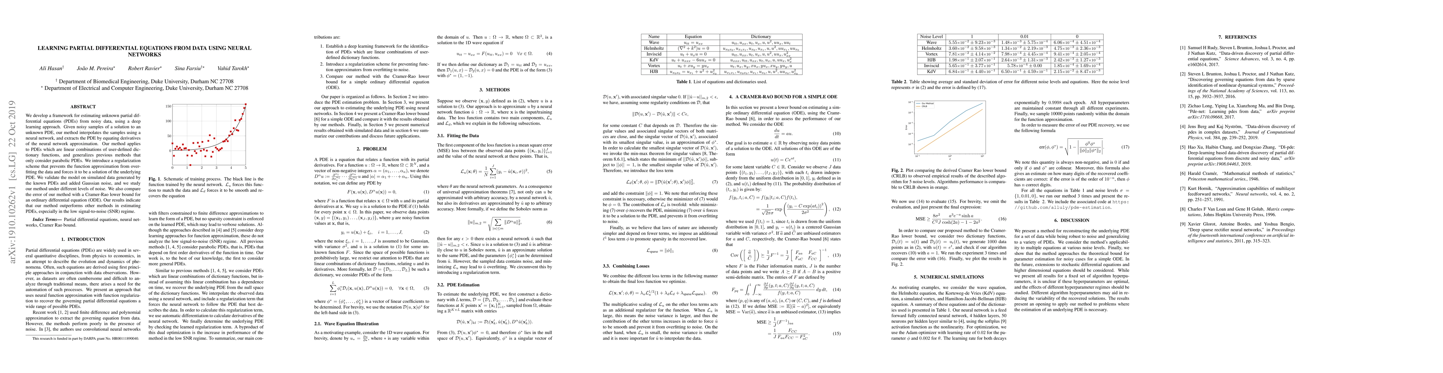 We develop a framework for estimating unknown partial differential equations from noisy data, using a deep learning approach. Given noisy samples of a solution to an unknown PDE, our method interpolates the samples using a neural network, and extracts the PDE by equating derivatives of the neural network approximation. Our method applies to PDEs which are linear combinations of user-defined dictionary functions, and generalizes previous methods that only consider parabolic PDEs. We introduce a regularization scheme that prevents the function approximation from overfitting the data and forces it to be a solution of the underlying PDE. We validate the model on simulated data generated by the known PDEs and added Gaussian noise, and we study our method under different levels of noise. We also compare the error of our method with a Cramer-Rao lower bound for an ordinary differential equation. Our results indicate that our method outperforms other methods in estimating PDEs, especially in the low signal-to-noise regime.