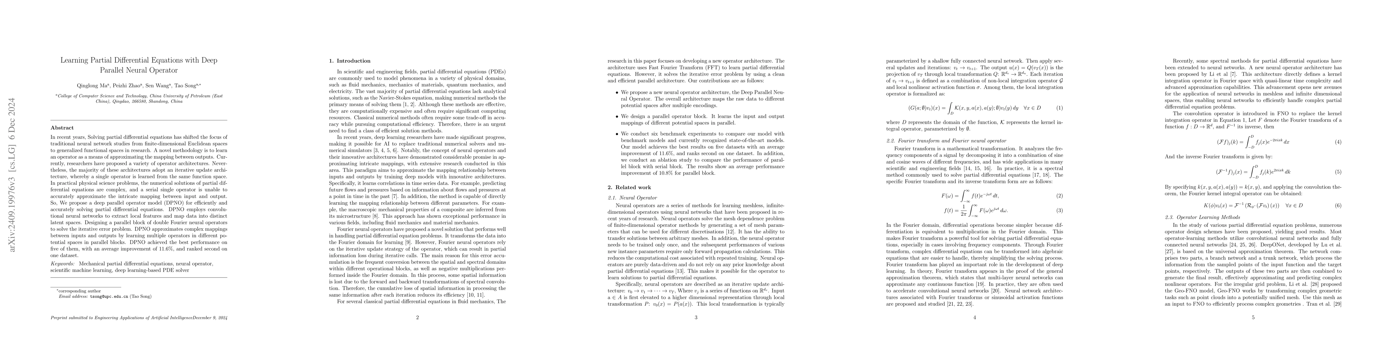 This paper introduces a deep parallel neural operator (DPNO) model that leverages convolutional neural networks and parallel operator blocks to efficiently solve complex partial differential equations. DPNO outperforms existing methods by learning multiple operators in parallel, achieving an average improvement of 10.5% on several datasets.