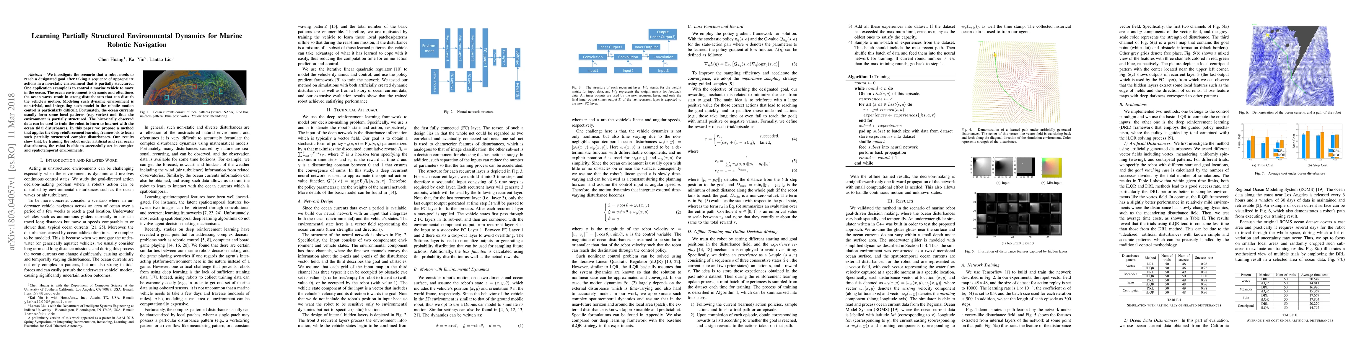 We investigate the scenario that a robot needs to reach a designated goal after taking a sequence of appropriate actions in a non-static environment that is partially structured. One application example is to control a marine vehicle to move in the ocean. The ocean environment is dynamic and oftentimes the ocean waves result in strong disturbances that can disturb the vehicle's motion. Modeling such dynamic environment is non-trivial, and integrating such model in the robotic motion control is particularly difficult. Fortunately, the ocean currents usually form some local patterns (e.g. vortex) and thus the environment is partially structured. The historically observed data can be used to train the robot to learn to interact with the ocean tidal disturbances. In this paper we propose a method that applies the deep reinforcement learning framework to learn such partially structured complex disturbances. Our results show that, by training the robot under artificial and real ocean disturbances, the robot is able to successfully act in complex and spatiotemporal environments.