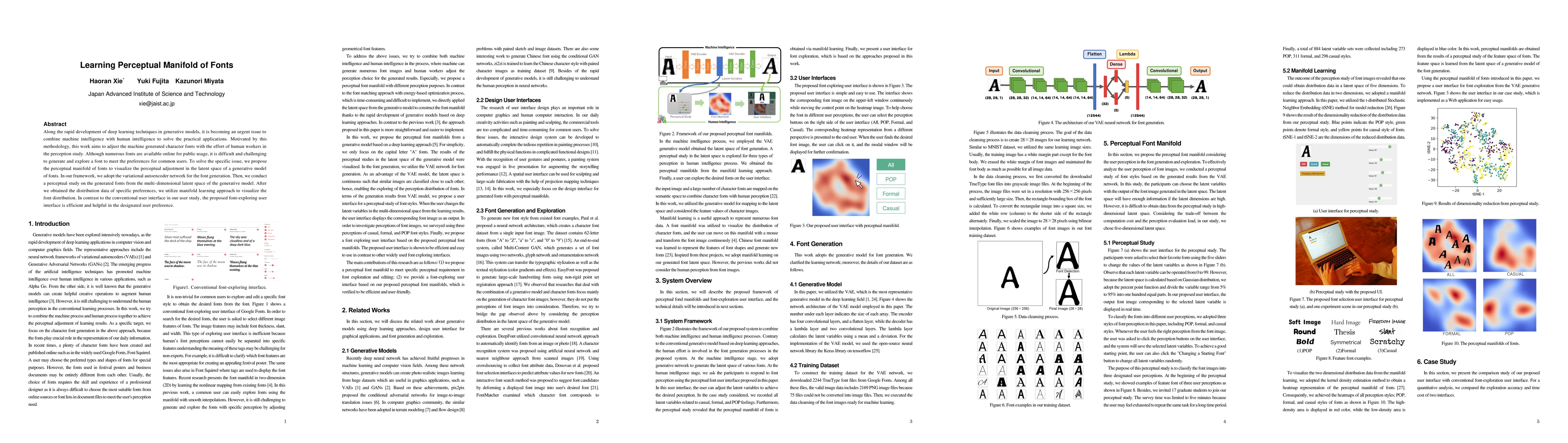 This research introduces the 'perceptual manifold of fonts,' a method using a variational autoencoder to generate and adjust fonts based on human preferences. It visualizes font adjustments in a generative model's latent space through a perceptual study, offering an efficient user interface for font design tailored to user preferences.