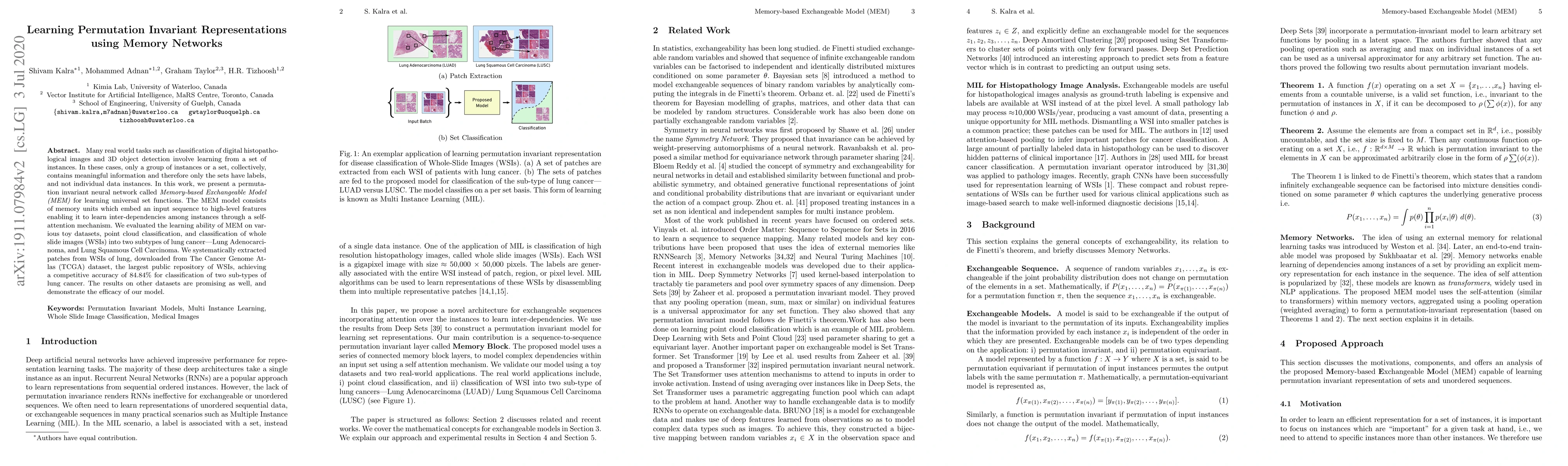 Many real-world tasks such as classification of digital histopathology images and 3D object detection involve learning from a set of instances. In these cases, only a group of instances or a set, collectively, contains meaningful information and therefore only the sets have labels, and not individual data instances. In this work, we present a permutation invariant neural network called Memory-based Exchangeable Model (MEM) for learning set functions. The MEM model consists of memory units that embed an input sequence to high-level features enabling the model to learn inter-dependencies among instances through a self-attention mechanism. We evaluated the learning ability of MEM on various toy datasets, point cloud classification, and classification of lung whole slide images (WSIs) into two subtypes of lung cancer---Lung Adenocarcinoma, and Lung Squamous Cell Carcinoma. We systematically extracted patches from lung WSIs downloaded from The Cancer Genome Atlas~(TCGA) dataset, the largest public repository of WSIs, achieving a competitive accuracy of 84.84\% for classification of two sub-types of lung cancer. The results on other datasets are promising as well, and demonstrate the efficacy of our model.