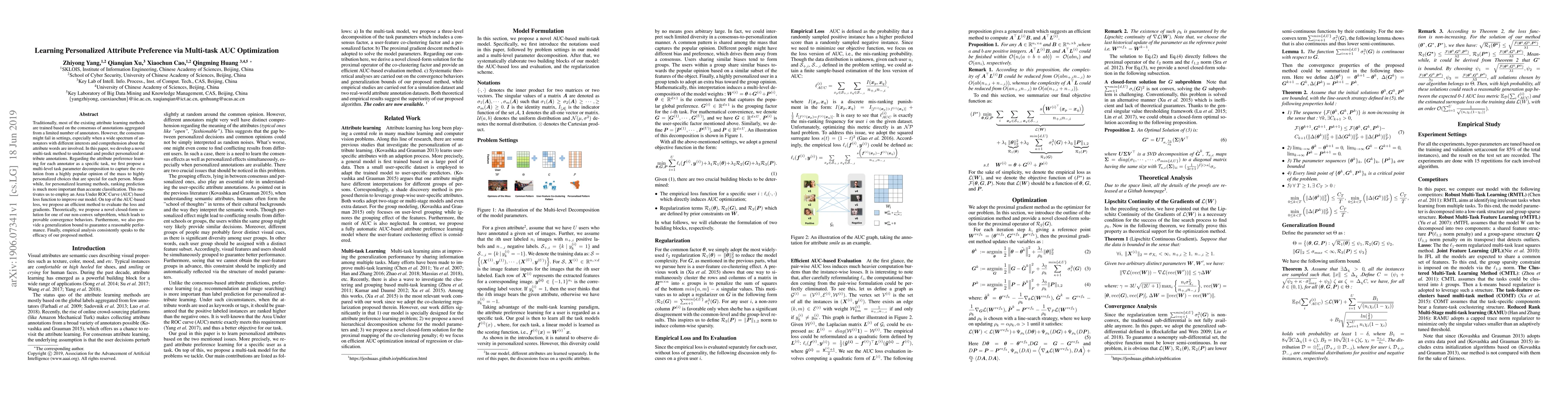 This paper introduces a novel multi-task learning method to predict personalized attribute preferences by decomposing task parameters to capture individual differences. It uses an AUC-based loss function for ranking prediction, providing theoretical convergence guarantees and empirical validation of its effectiveness.