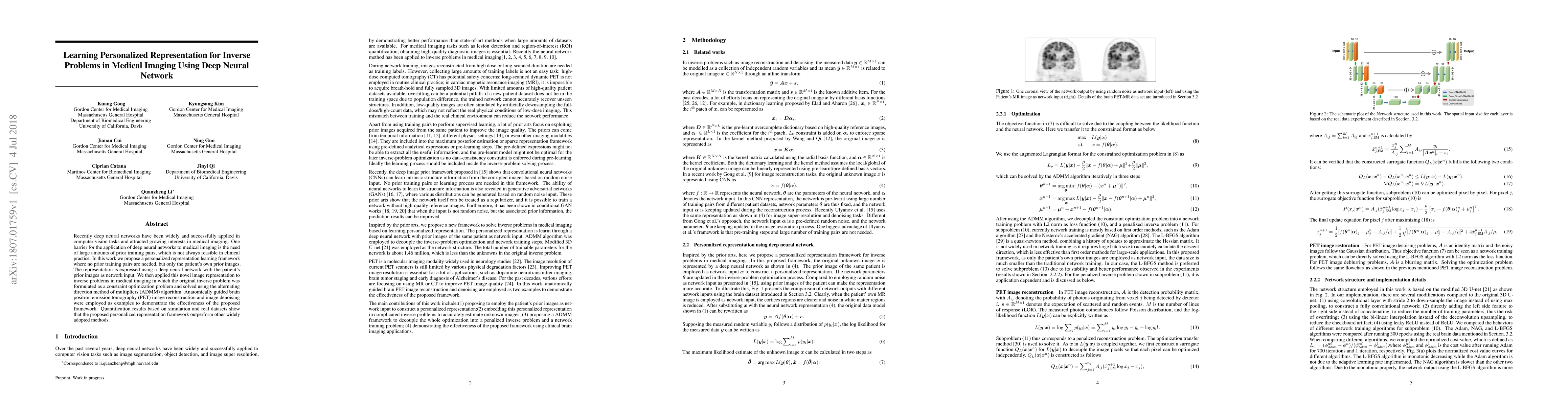 This paper proposes a personalized representation learning framework for solving inverse problems in medical imaging using deep neural networks, eliminating the need for large training pairs by utilizing only the patient's prior images. The method is demonstrated through brain PET image reconstruction and denoising, outperforming other methods according to simulation and real-data quantification results.