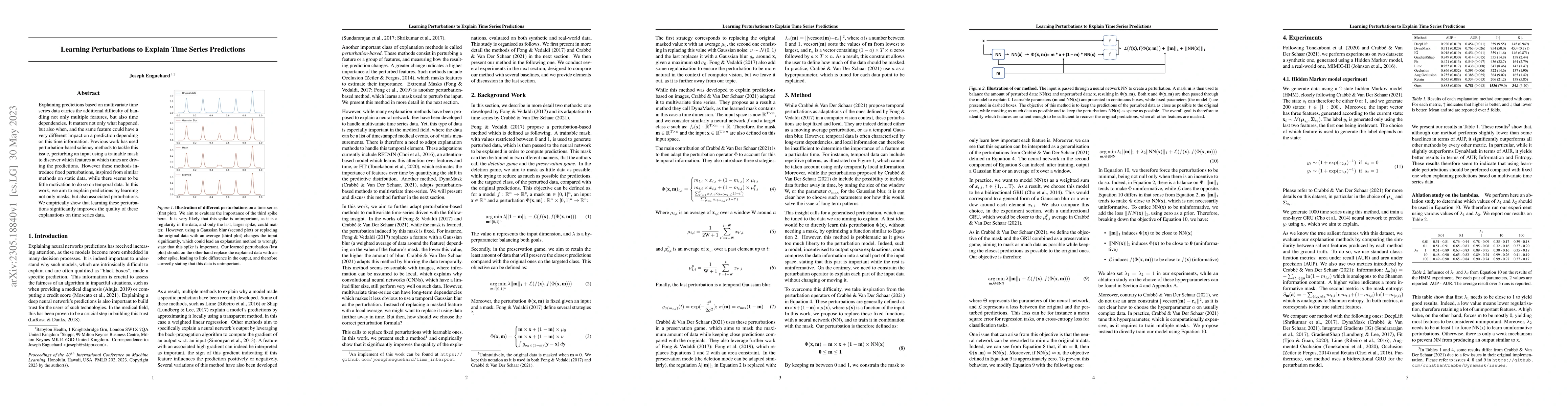 This paper proposes a method to improve the explanation of time series predictions by learning both masks and associated perturbations, rather than using fixed perturbations. The authors demonstrate that this adaptive approach significantly enhances the quality of explanations compared to traditional perturbation-based methods.