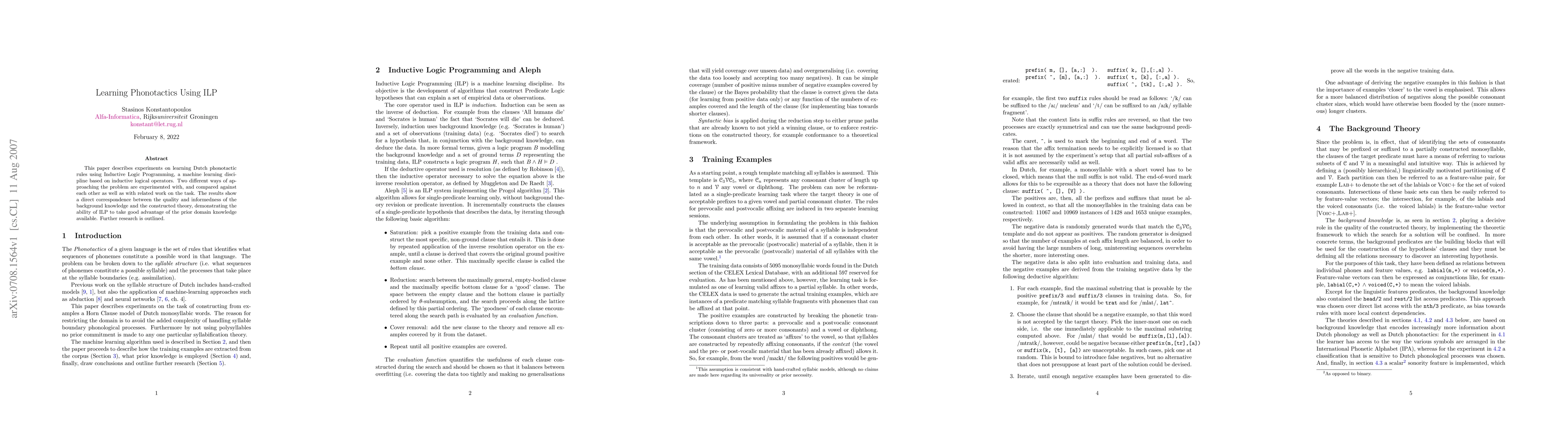This paper explores the use of Inductive Logic Programming (ILP) to learn Dutch phonotactic rules, comparing two approaches and highlighting the importance of background knowledge. Results indicate that ILP effectively leverages prior domain knowledge, suggesting promising avenues for further research.