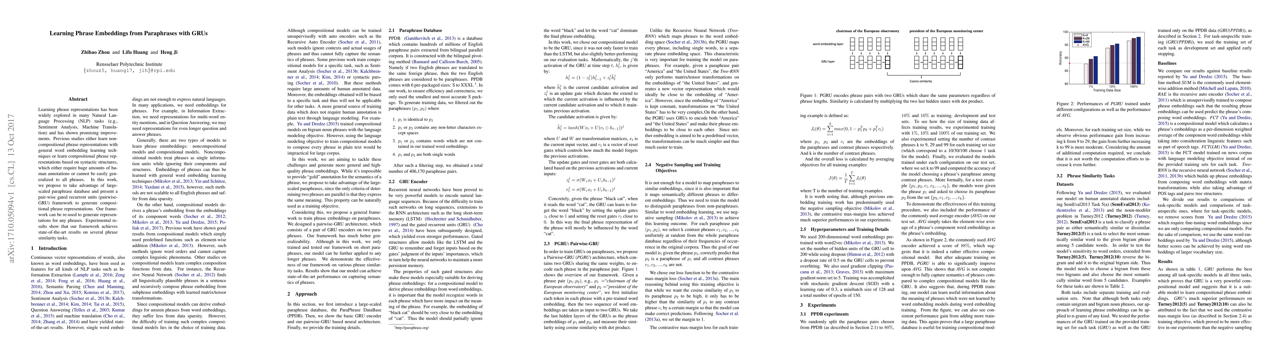 This paper proposes a pairwise-GRU framework to learn compositional phrase embeddings from large-scale paraphrase databases, achieving state-of-the-art results on phrase similarity tasks without requiring extensive human annotations. The method leverages paraphrases to generate representations that generalize well across different phrases.