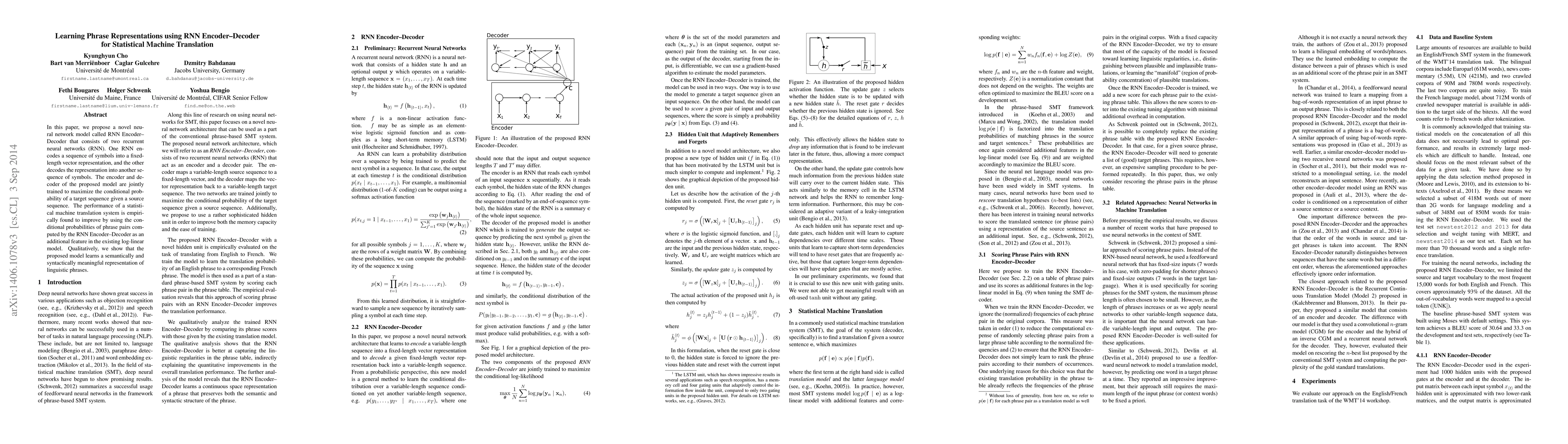 This paper introduces an RNN Encoder-Decoder model for statistical machine translation, which encodes source sequences into fixed-length vectors and decodes them into target sequences. The model improves translation performance by incorporating learned phrase representations as features in the log-linear model.